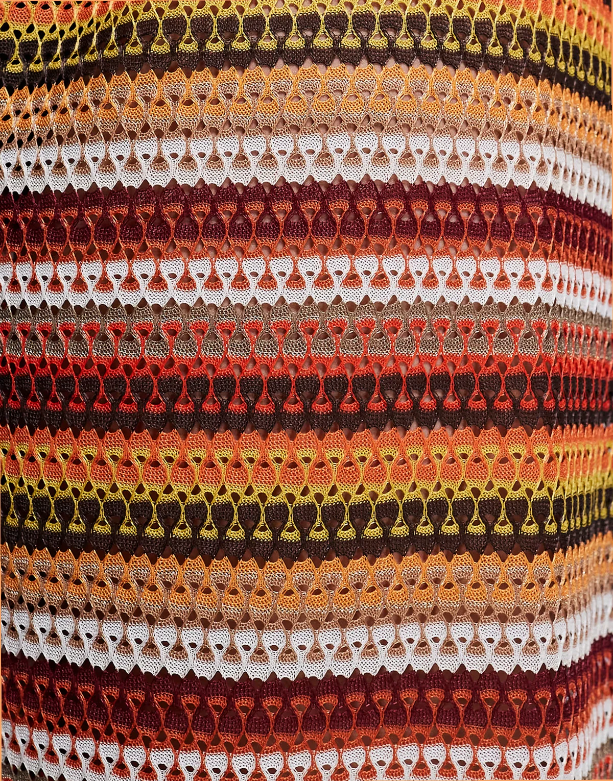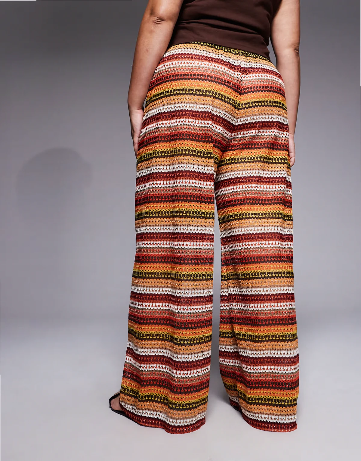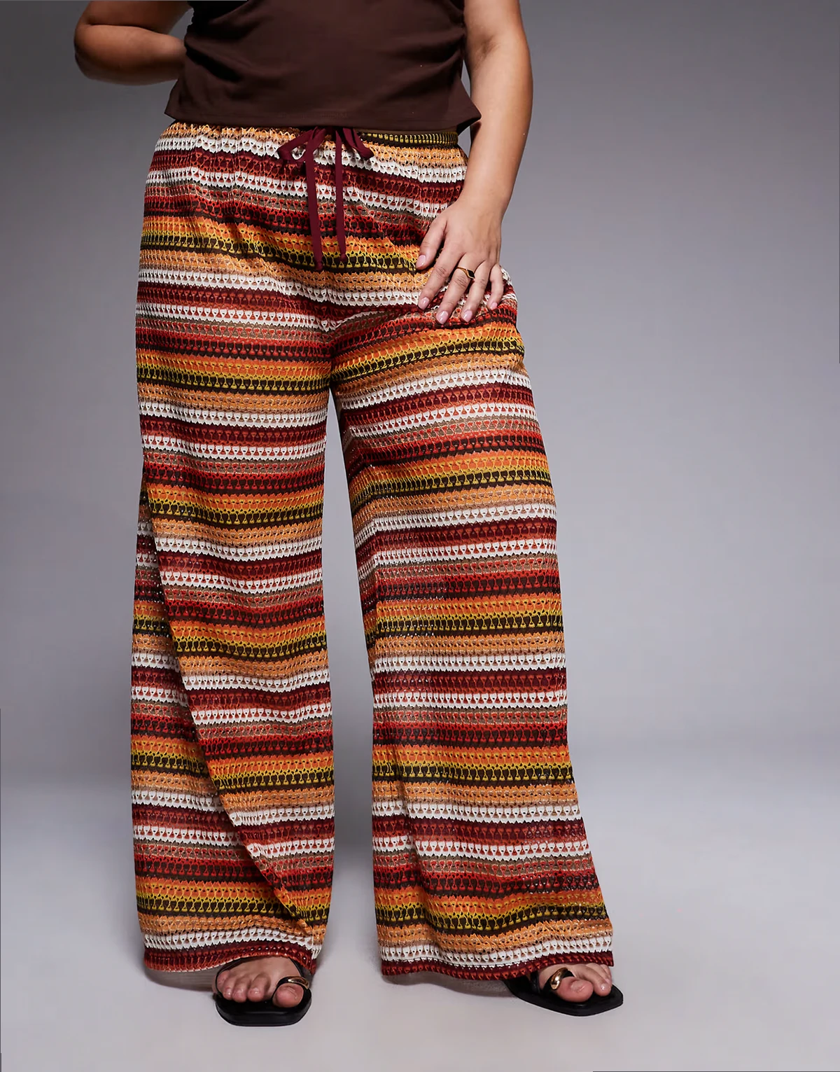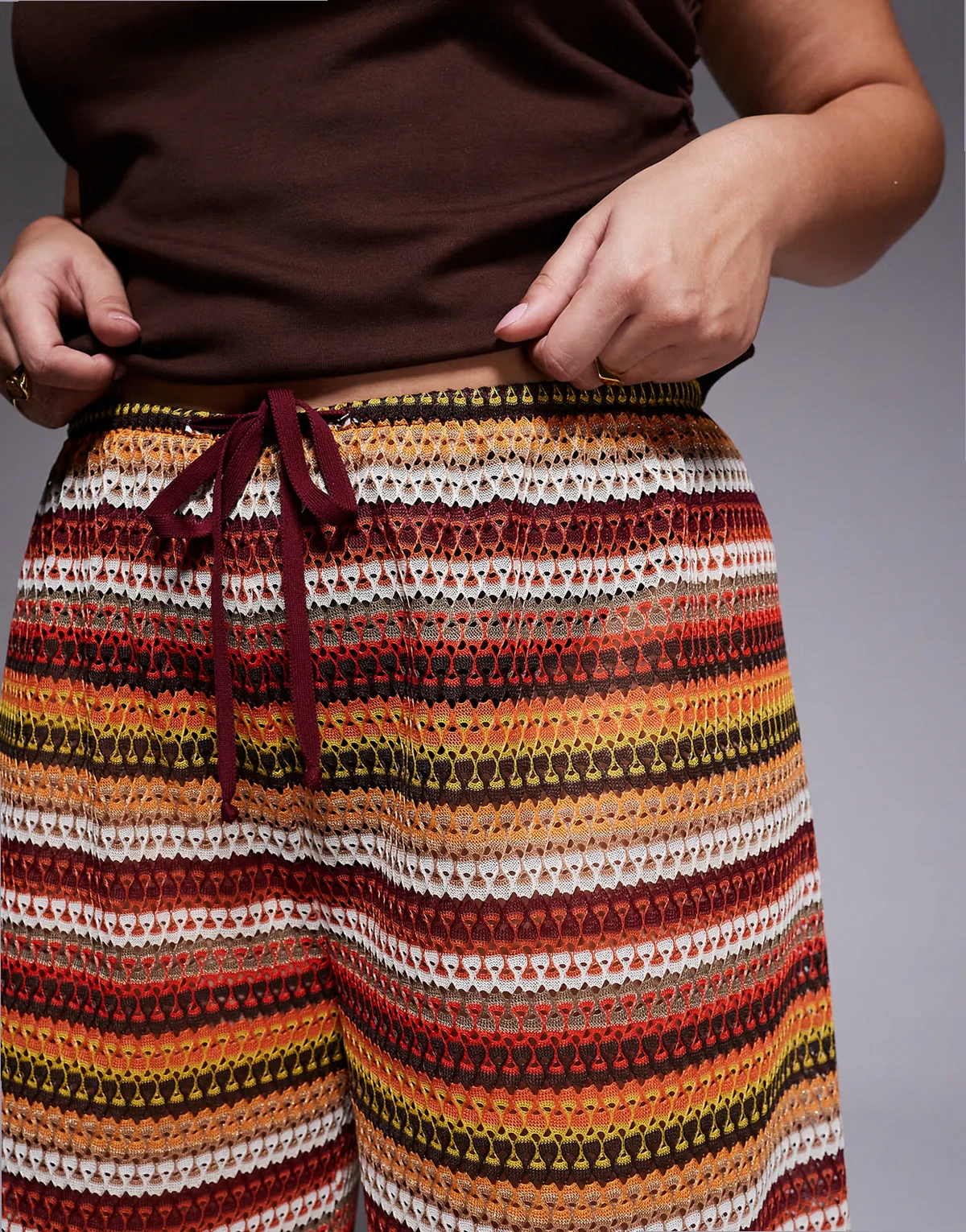 – Bordowe, szydełkowane spodnie z szerokimi nogawkami, w paski