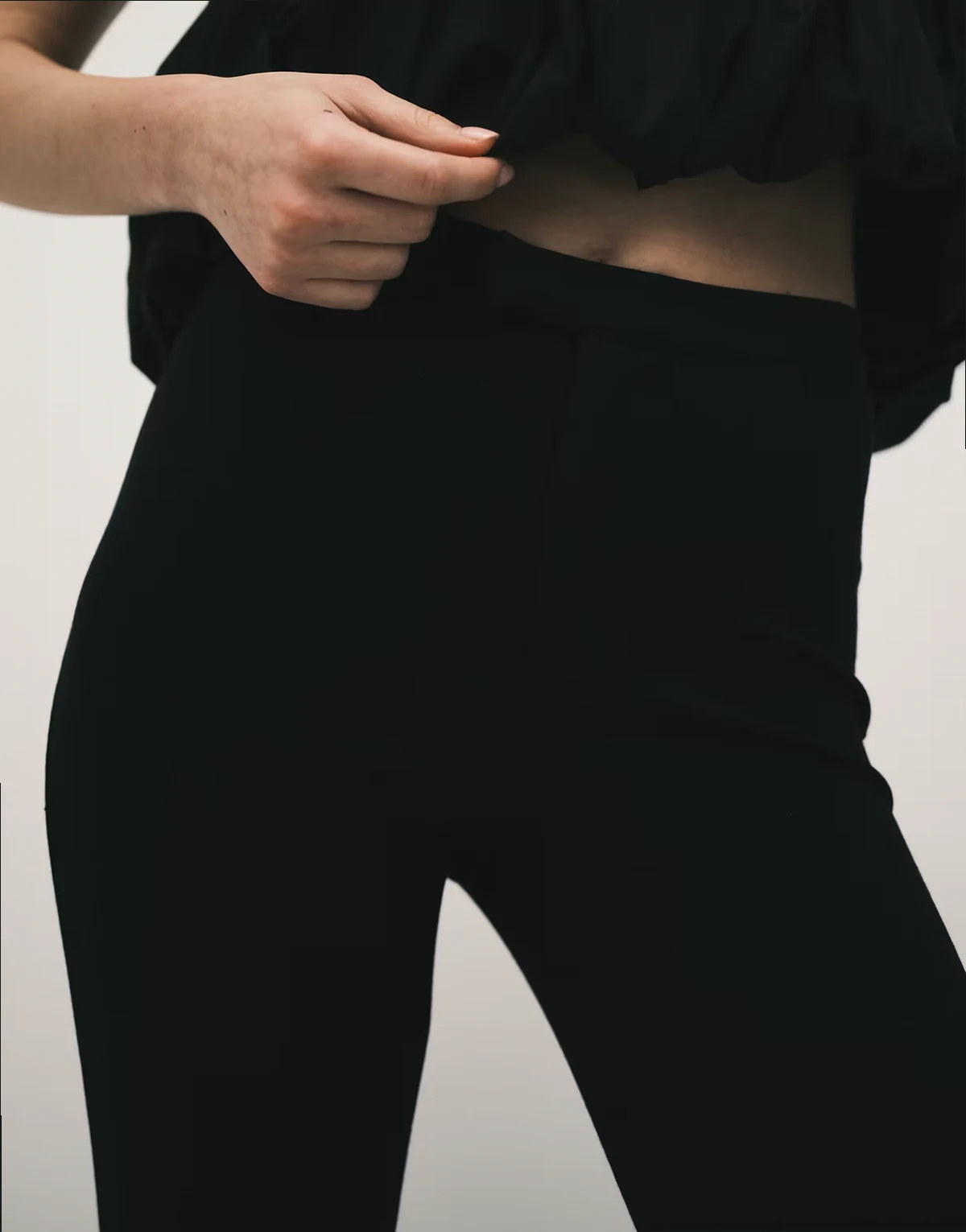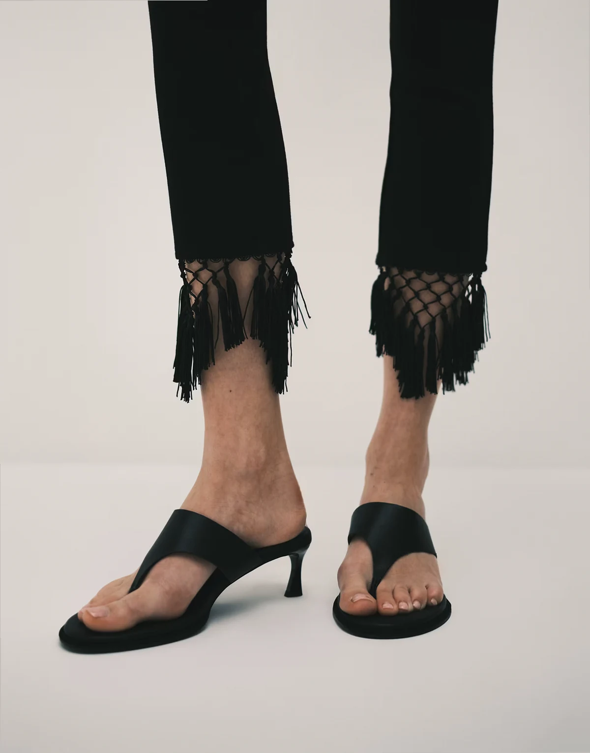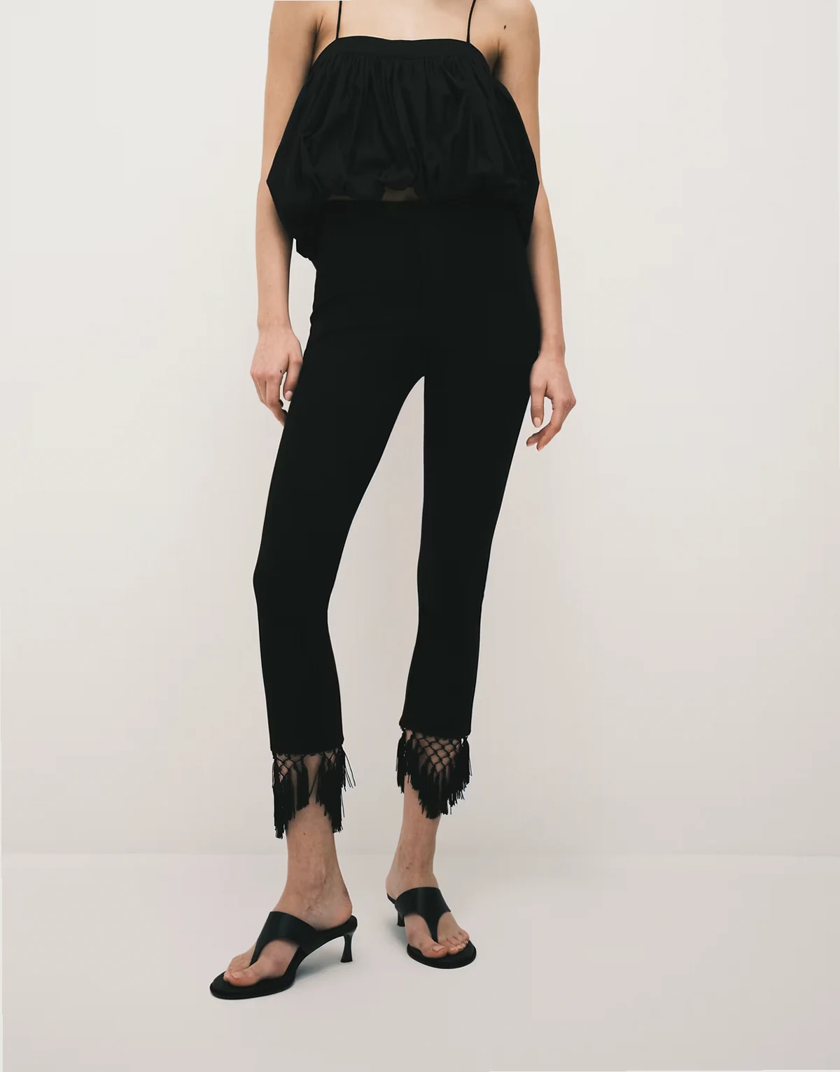 – Czarne spodnie capri z tkaniny ponte z frędzlami na dole
