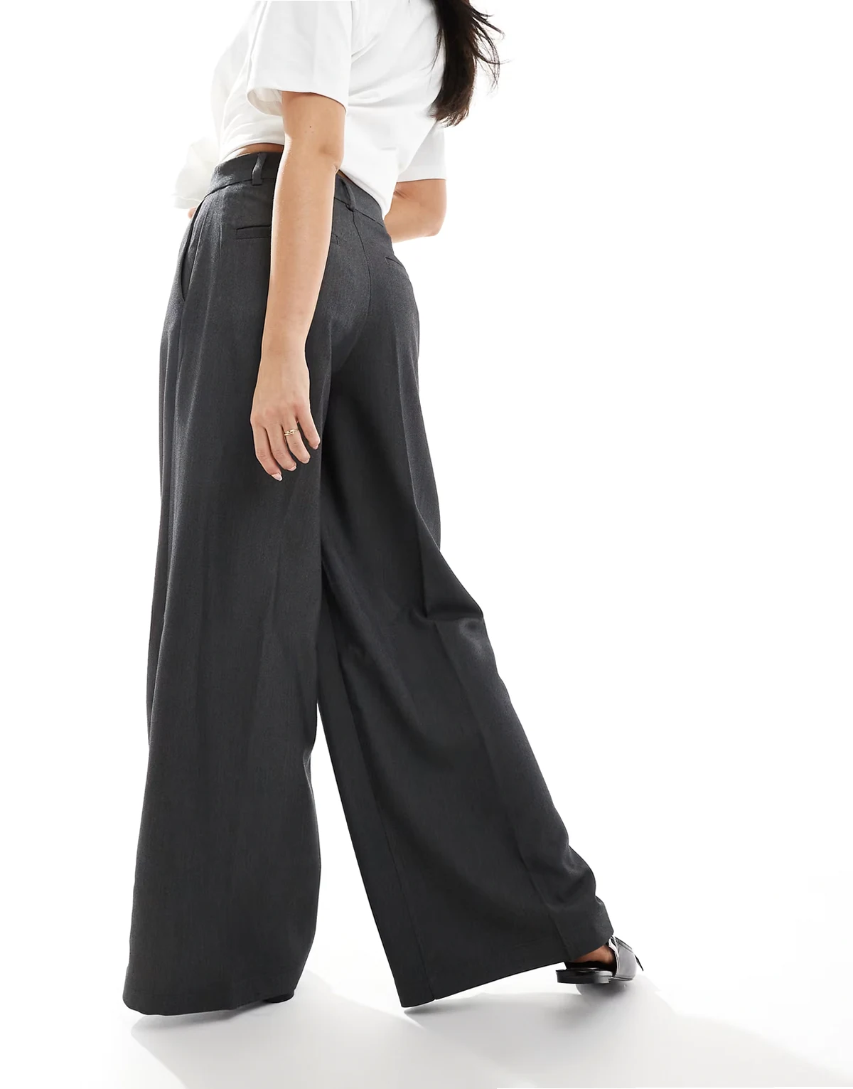 – Dopasowane spodnie z szerokimi nogawkami i podwyższonym stanem w ciemnoszarym melanżowym kolorze