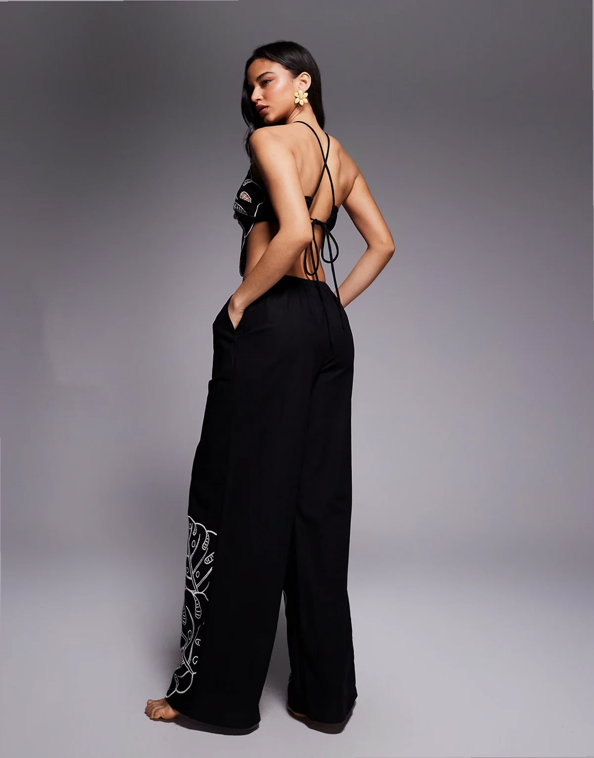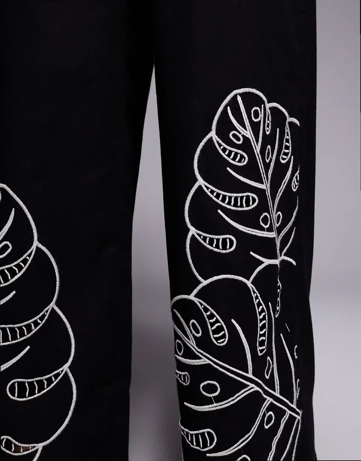 – Jasmine – Czarne spodnie plażowe z wycięciami z tropikalnym motywem
