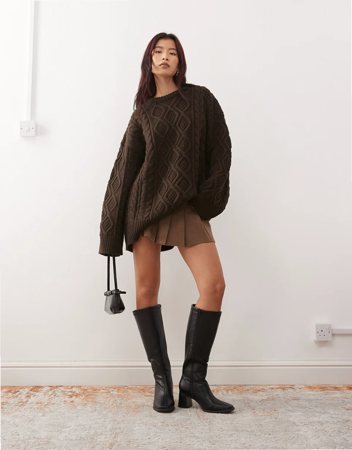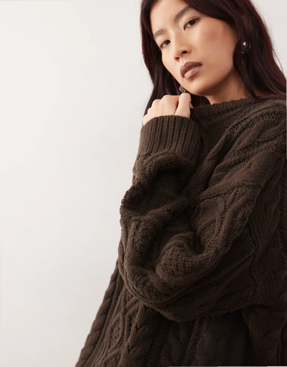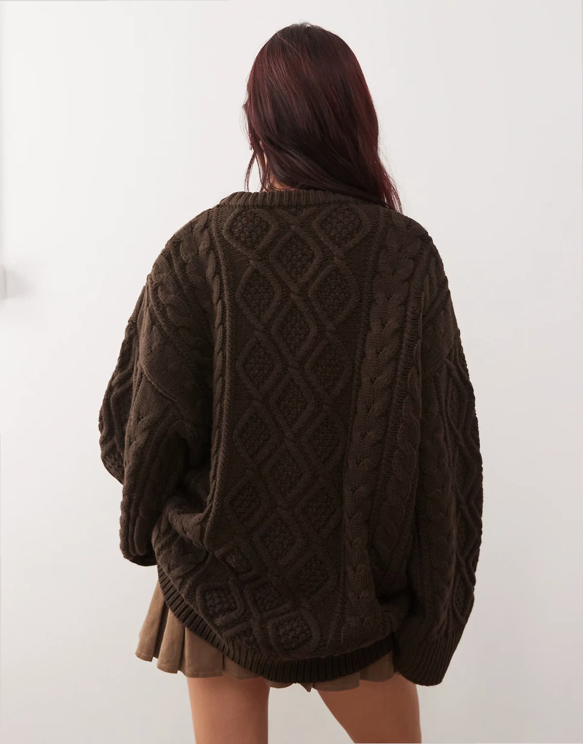 – Gigi – Czekoladowy sweter oversize z szerokimi rękawami z dzianiny o grubym warkoczowym splocie