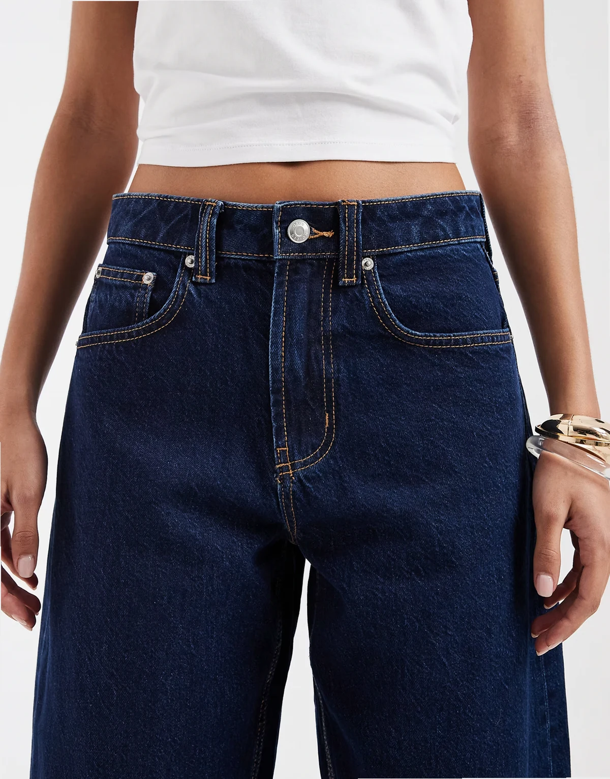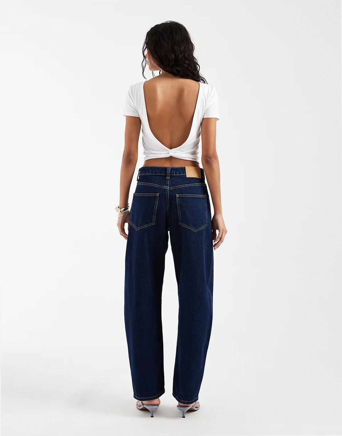 – Granatowe dopasowane jeansy barrel