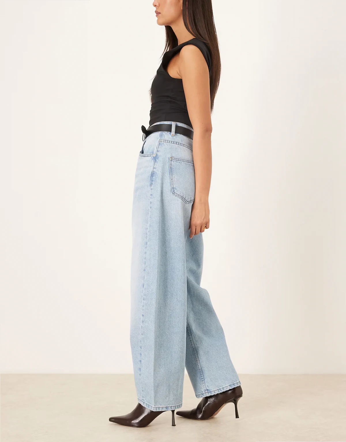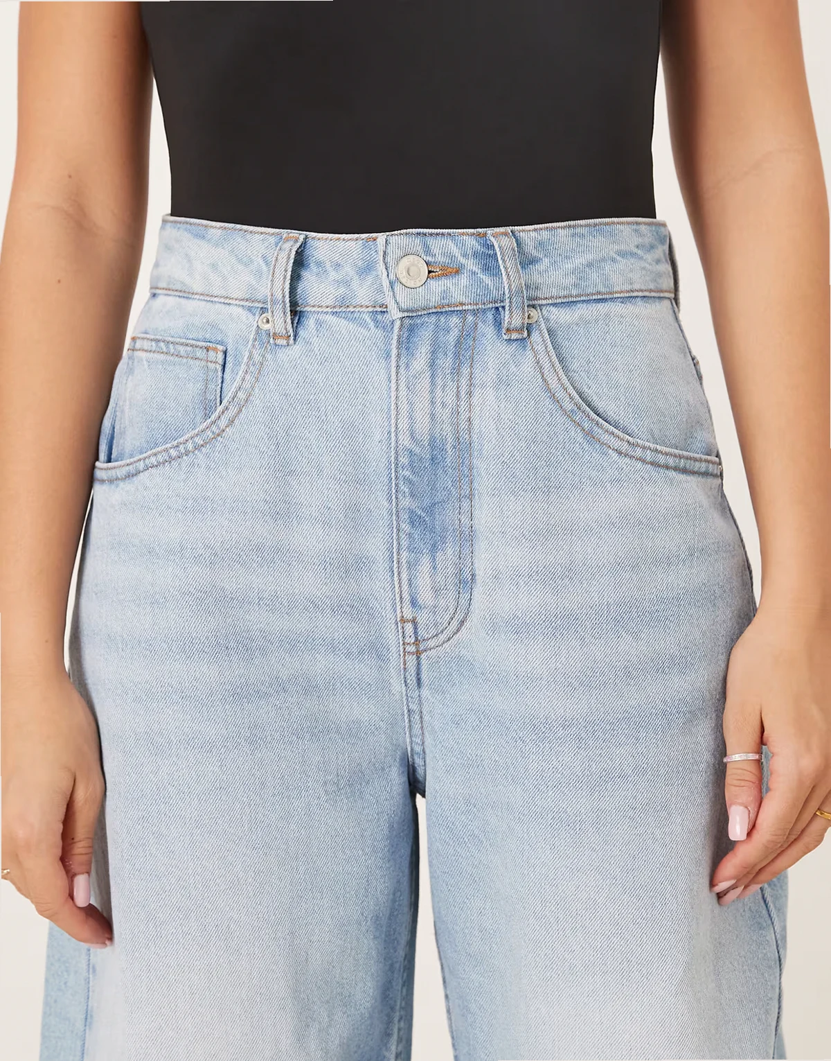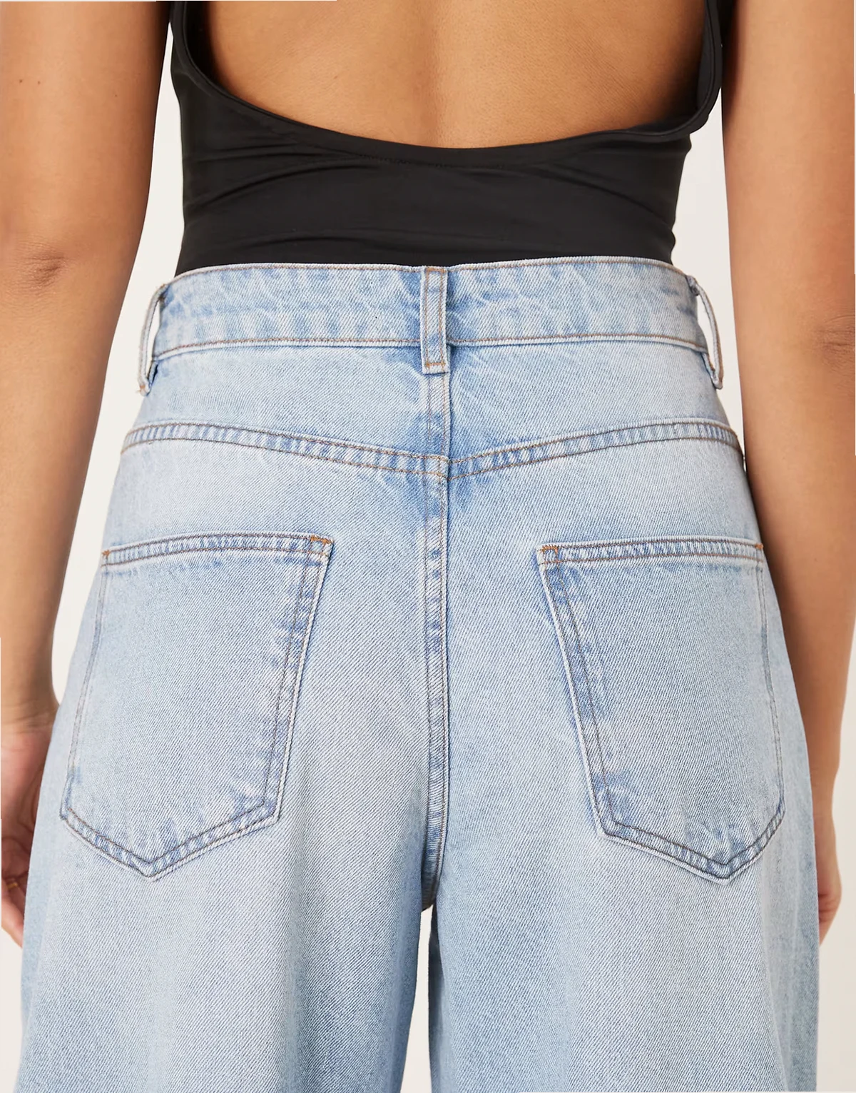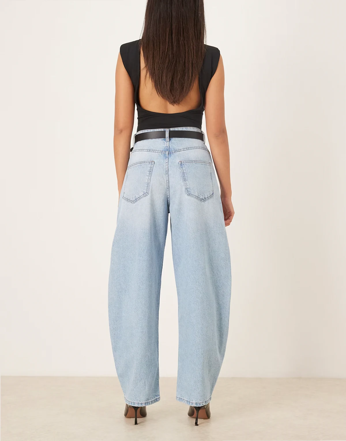 – Jasnoniebieskie jeansy z wysokim stanem i baryłkowatymi nogawkami