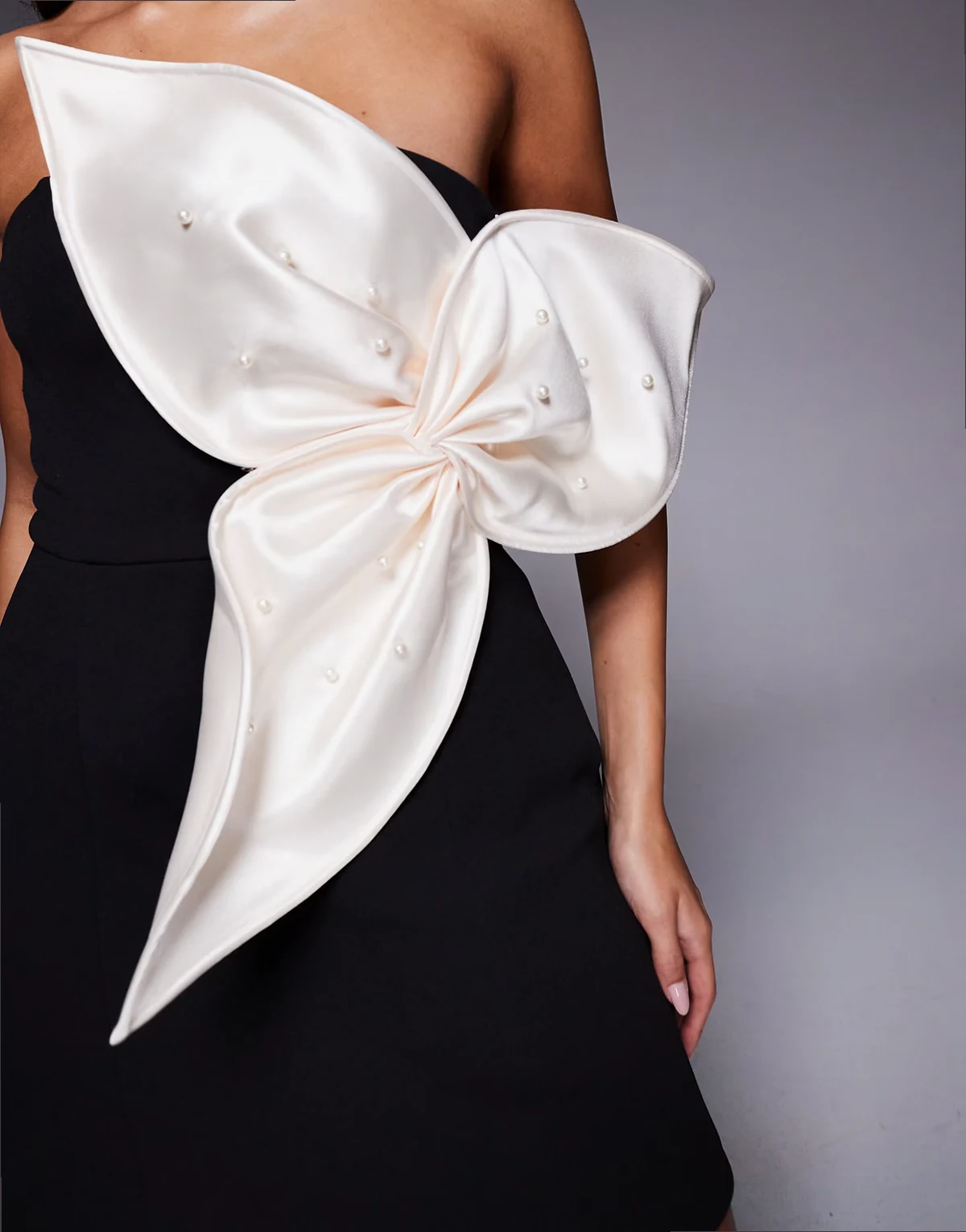 4. – Czarna sukienka mini z dekoltem bandeau i kwiatem 3D