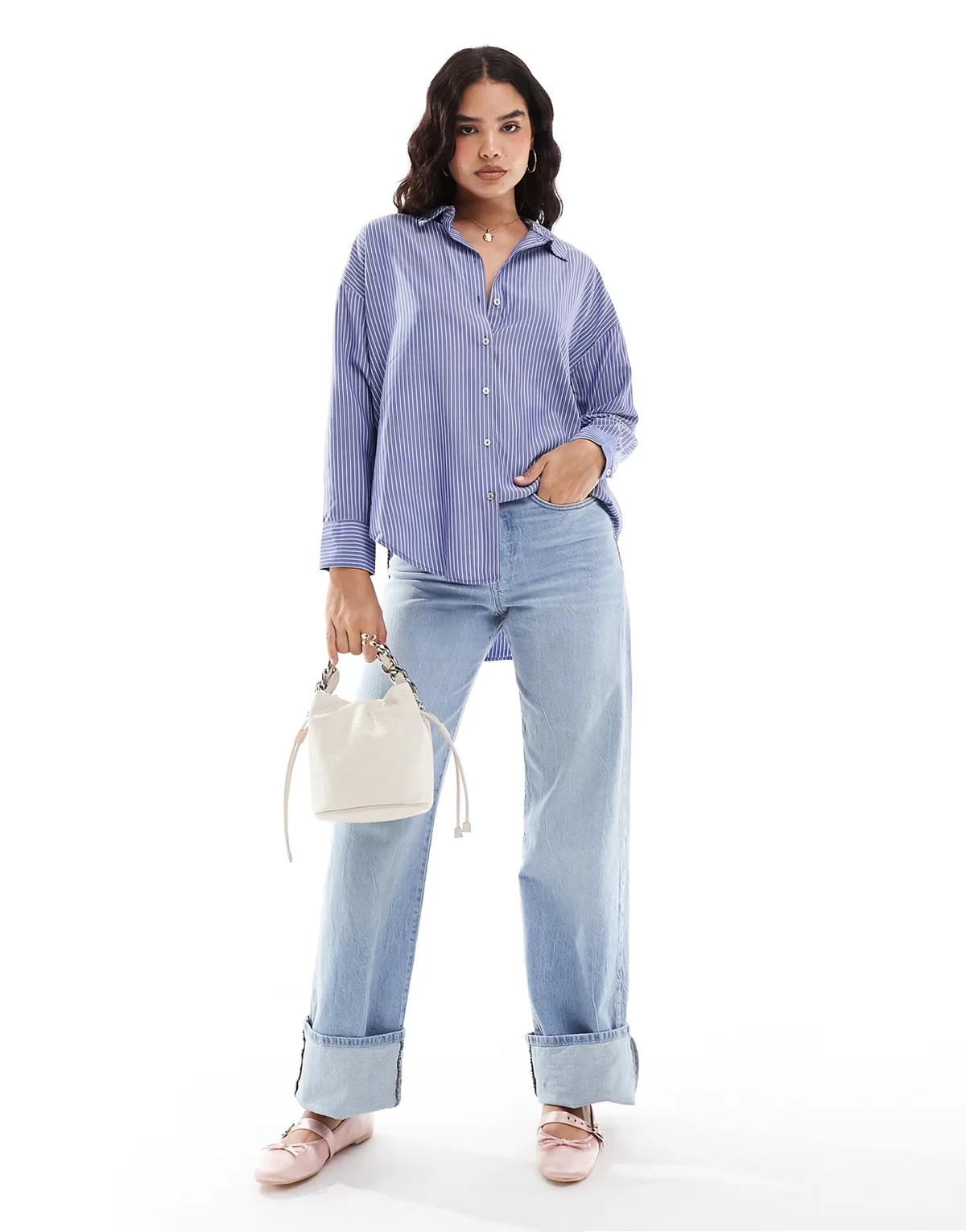 – Kopertowa koszula w prążki z rękawami typu kokon