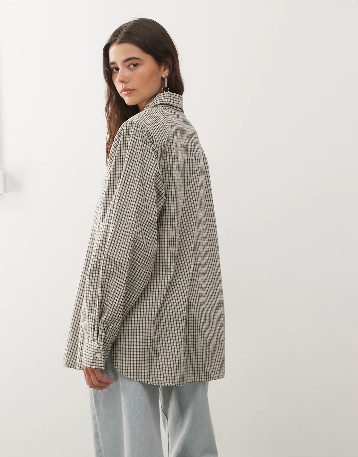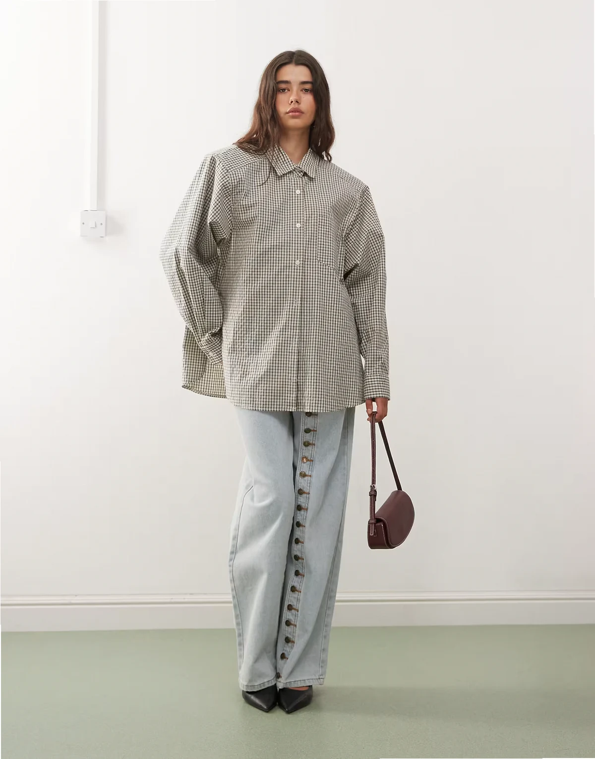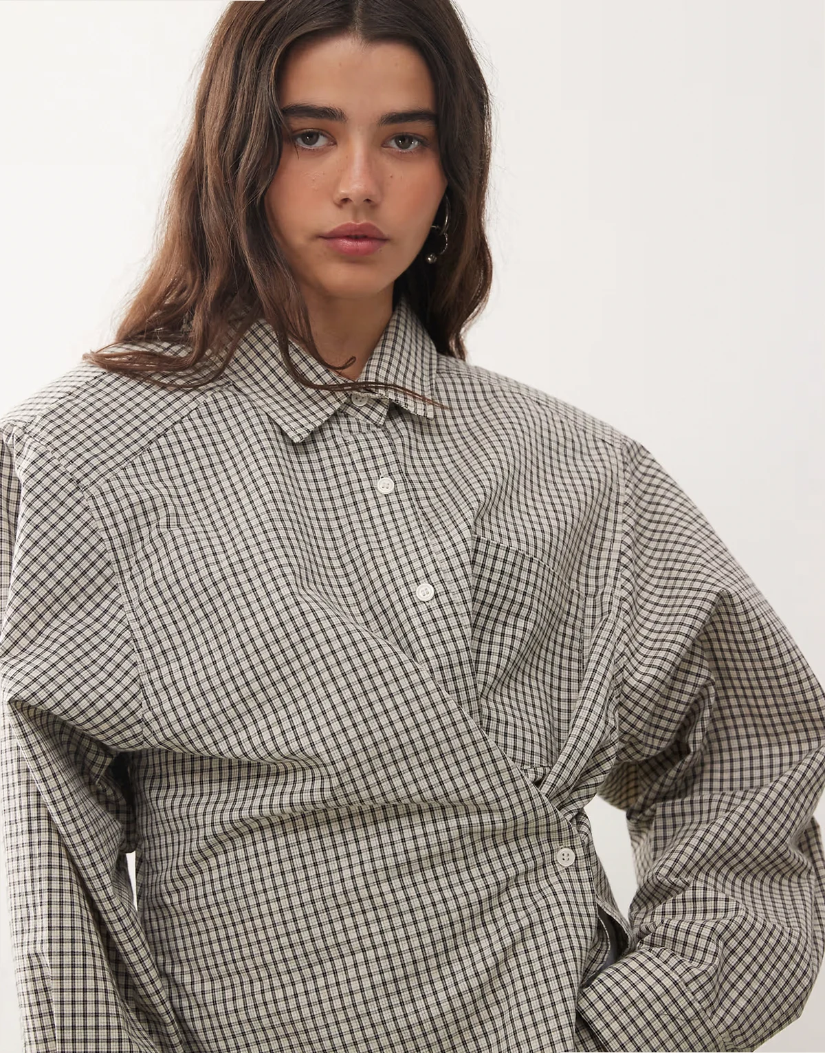 – Notting Hill – Kremowa koszula w kratkę z poduszkami na ramionach zapinana z przodu na guziki na różne sposoby