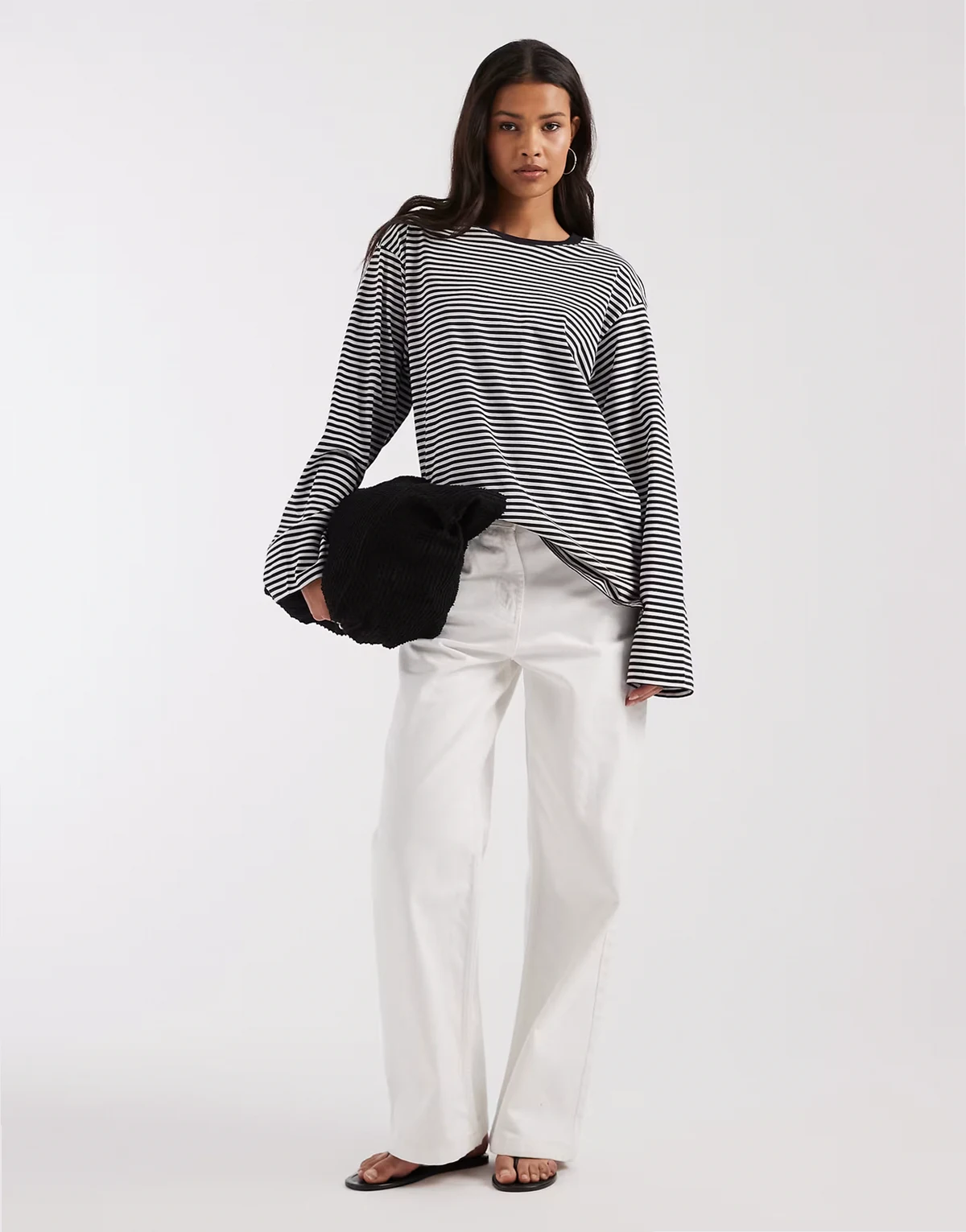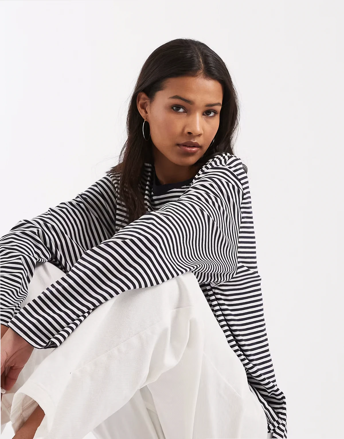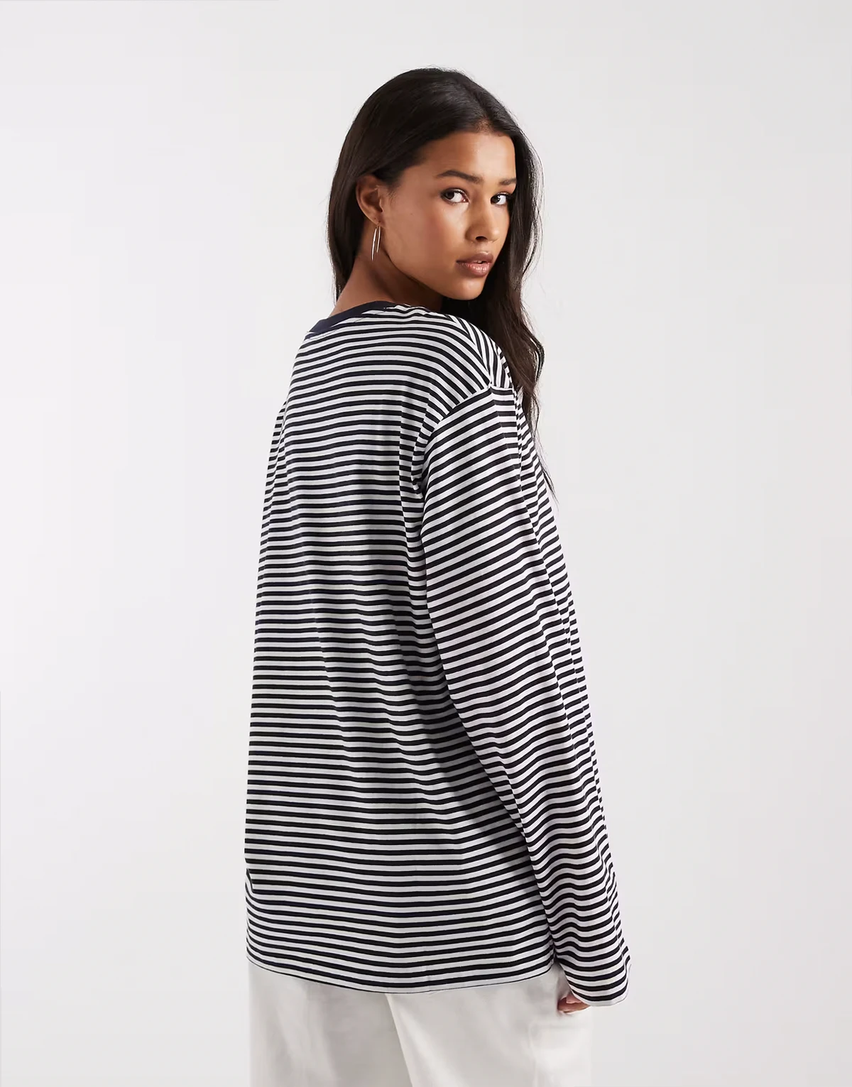 – Ciemnoniebieski T-shirt oversize z długimi rękawami i wzorem w paski