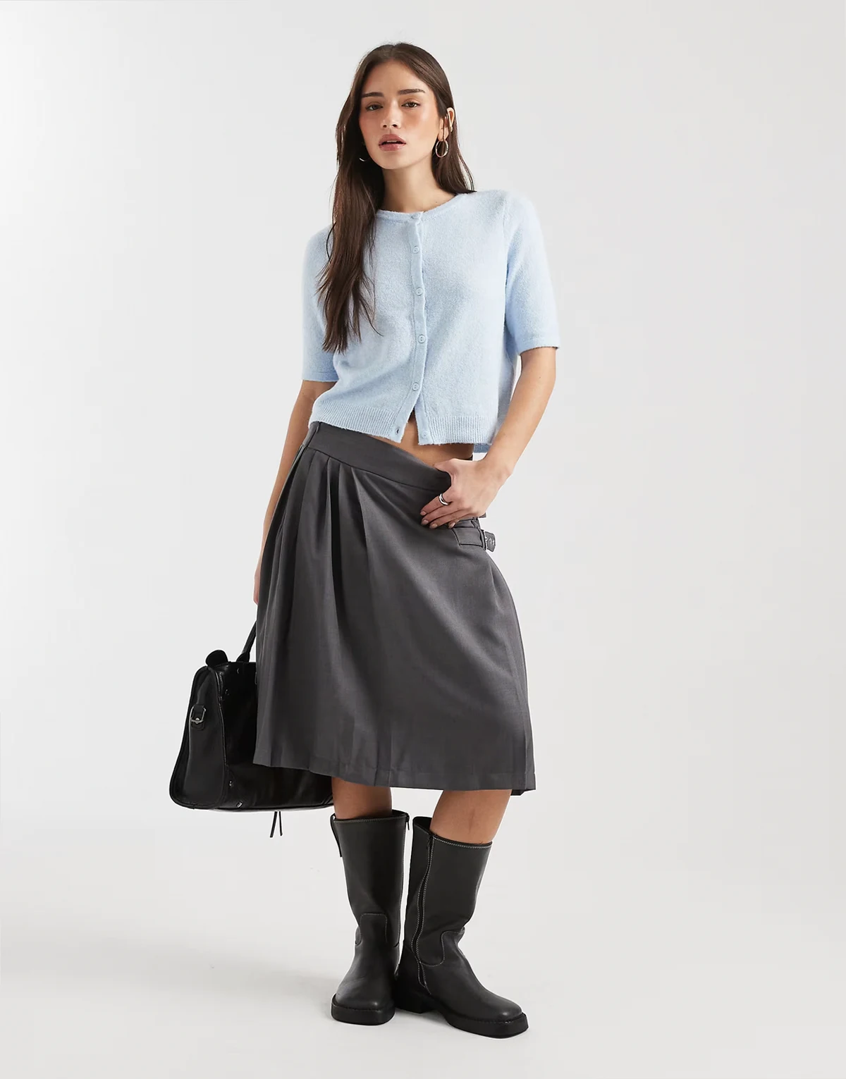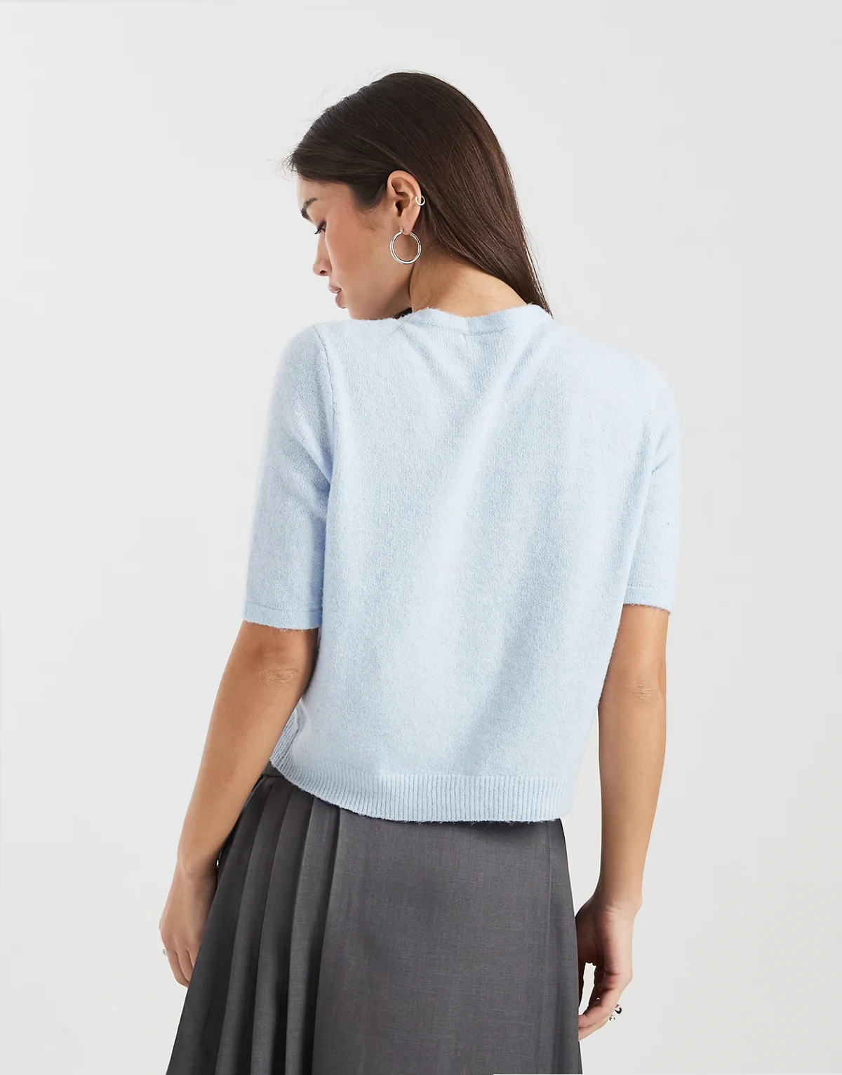 – Jasnoniebieski kardigan z krótkimi rękawami i okrągłym dekoltem