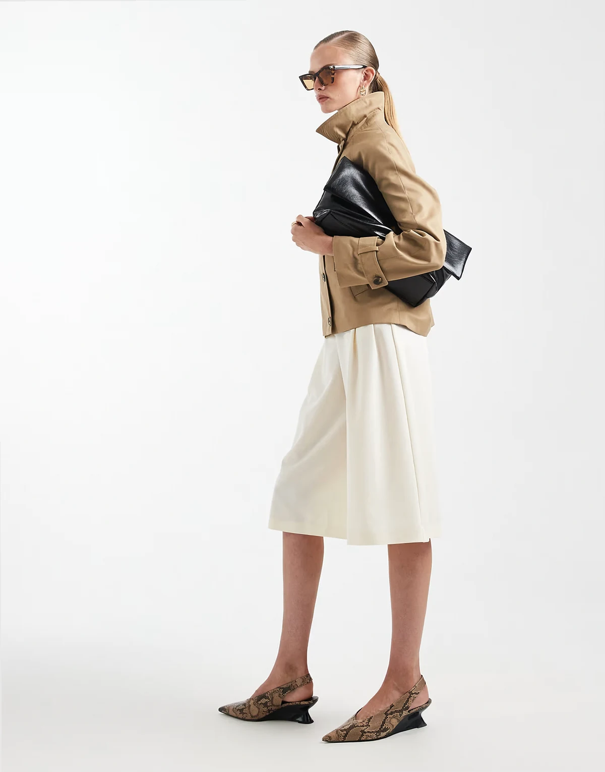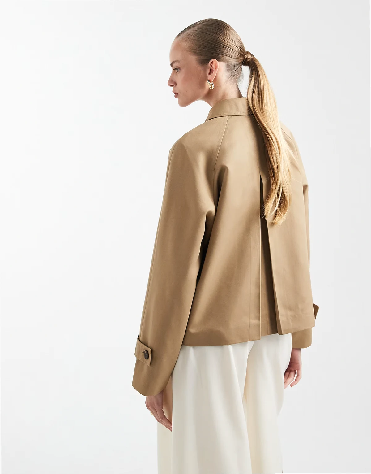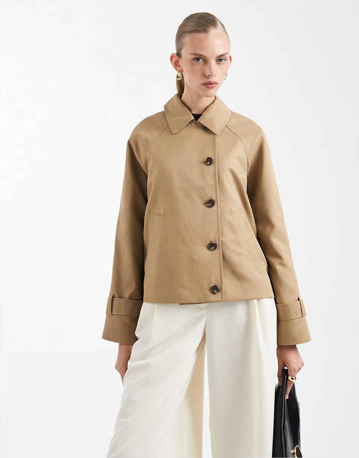 – Beżowa kurtka z asymetrycznym zapięciem na guziki