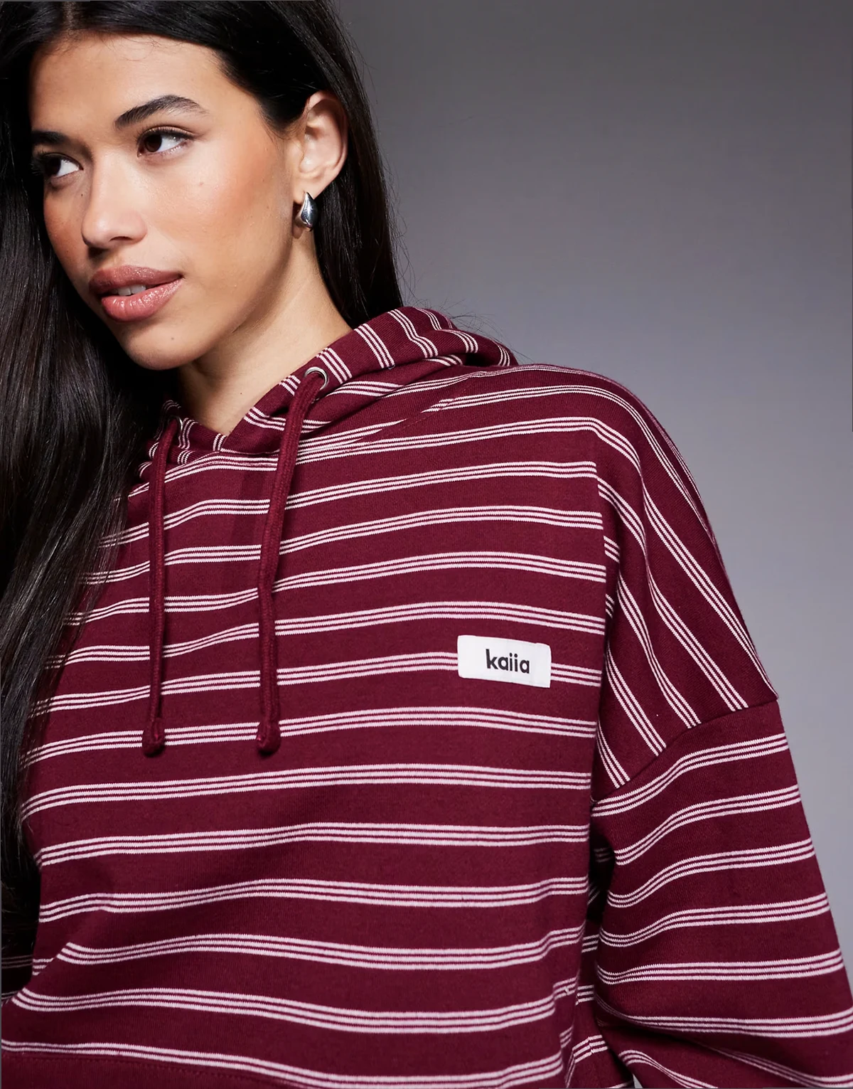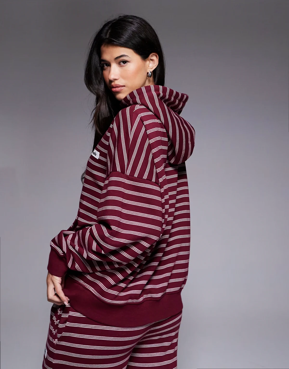 – Bluza oversize z mieszanki bawełny w bordowo-kremowe paski z kapturem i naszywką z logo, część zestawu