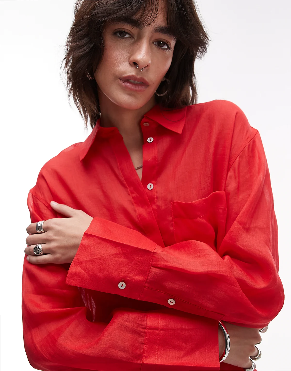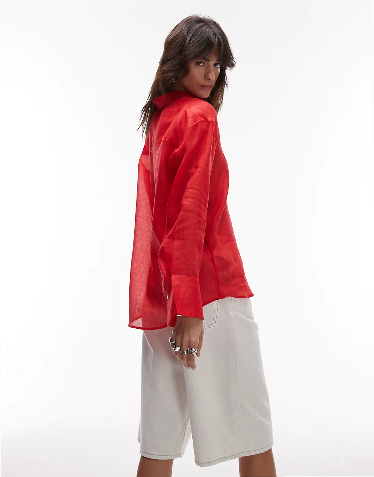 – Czerwona koszula z długimi rękawami z lekko prześwitującej ramii