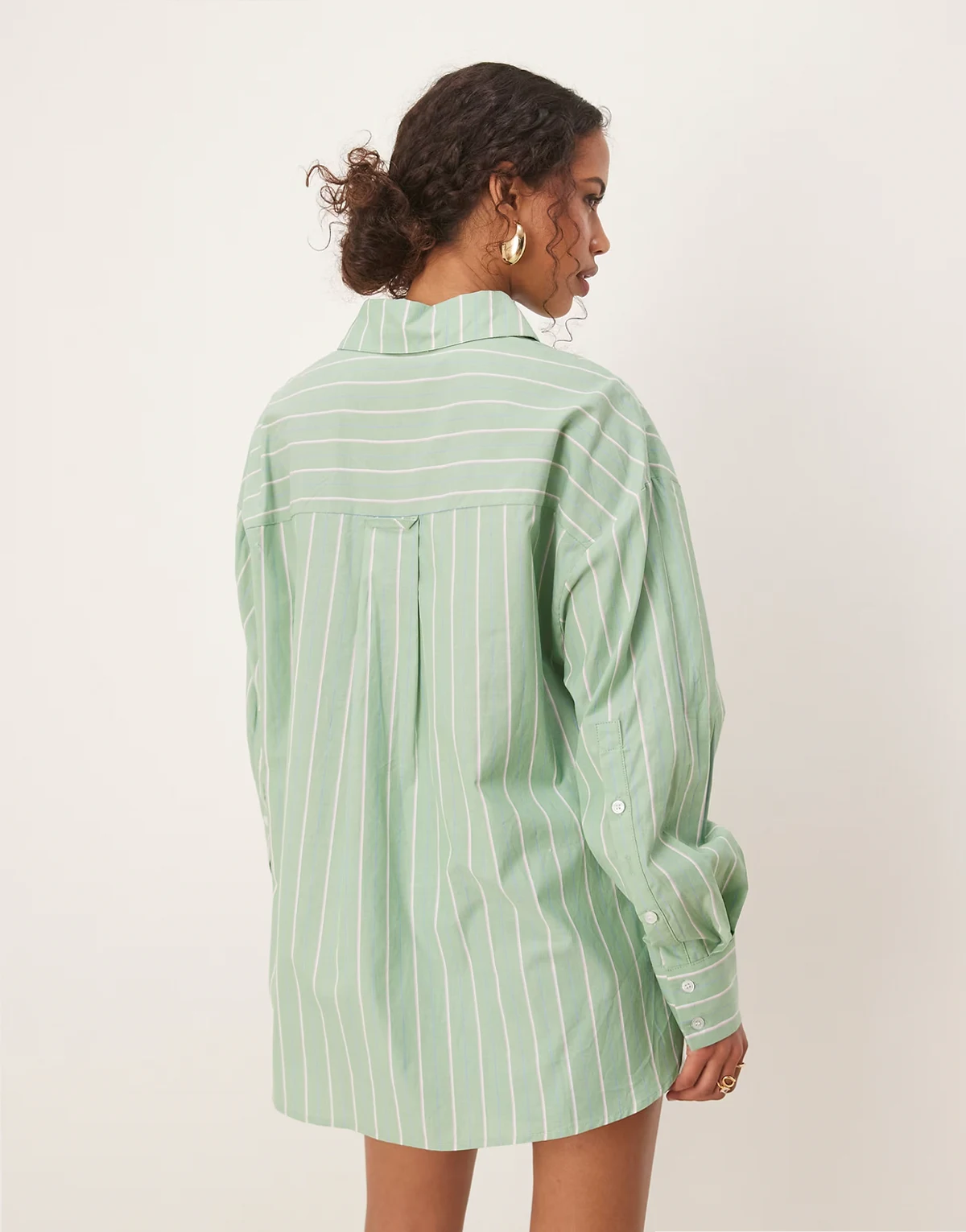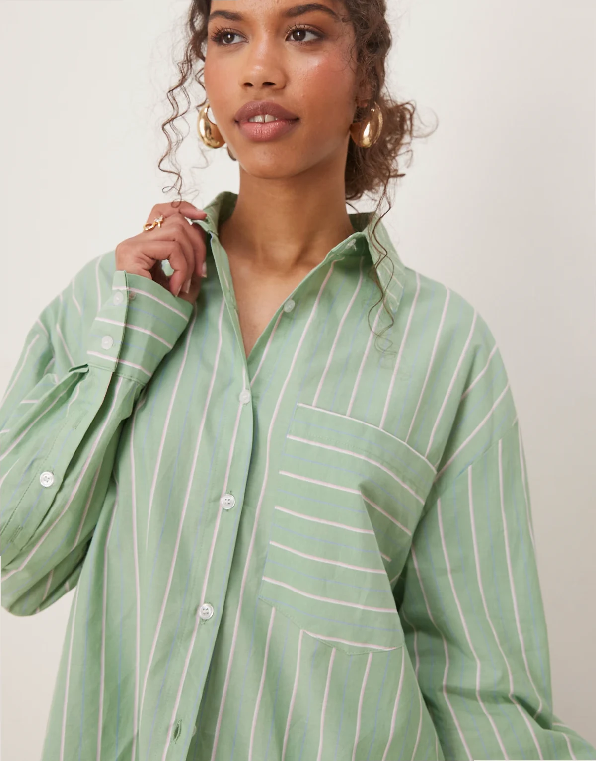 – Kopertowa koszula w prążki z rękawami typu kokon