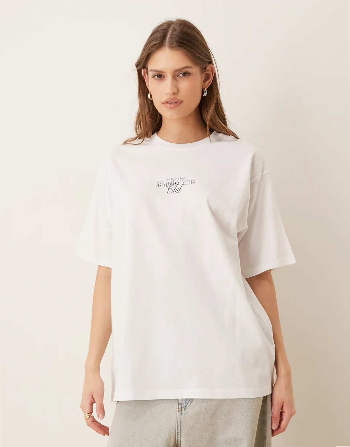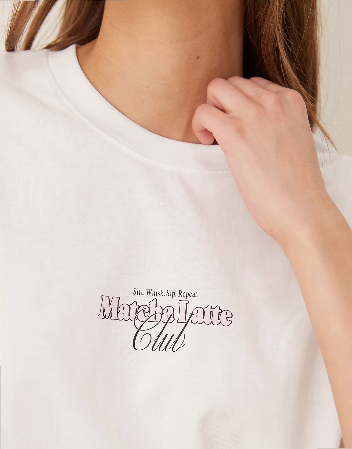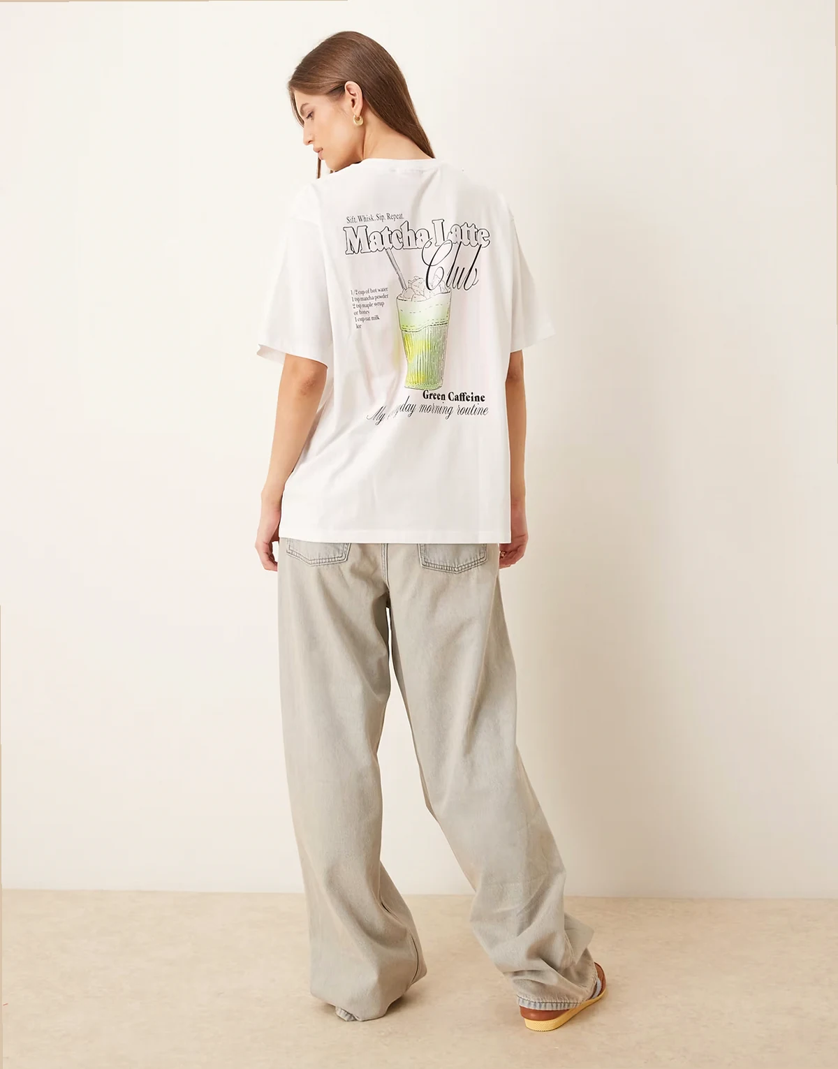 – Biały T-shirt oversize z nadrukiem z matchą na plecach