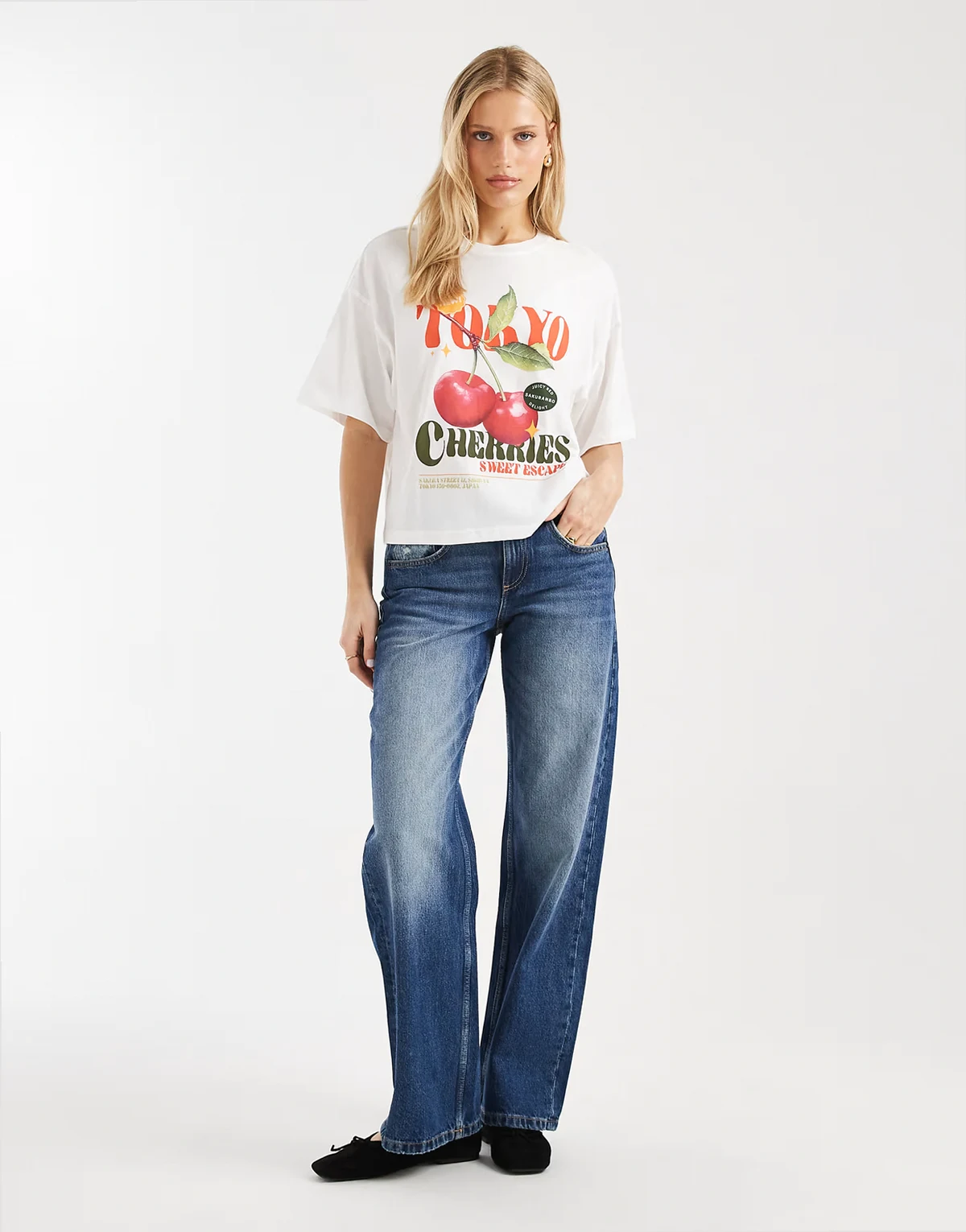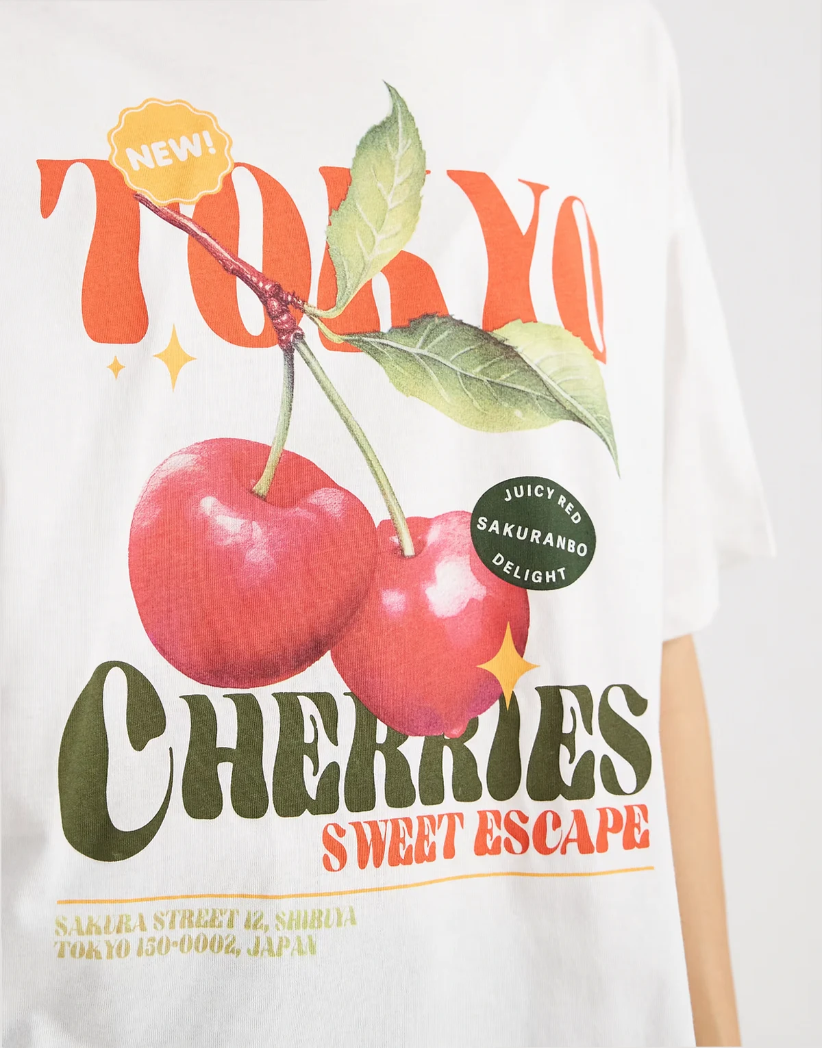 – Biały T-shirt o pudełkowym kroju z nadrukiem wiśni