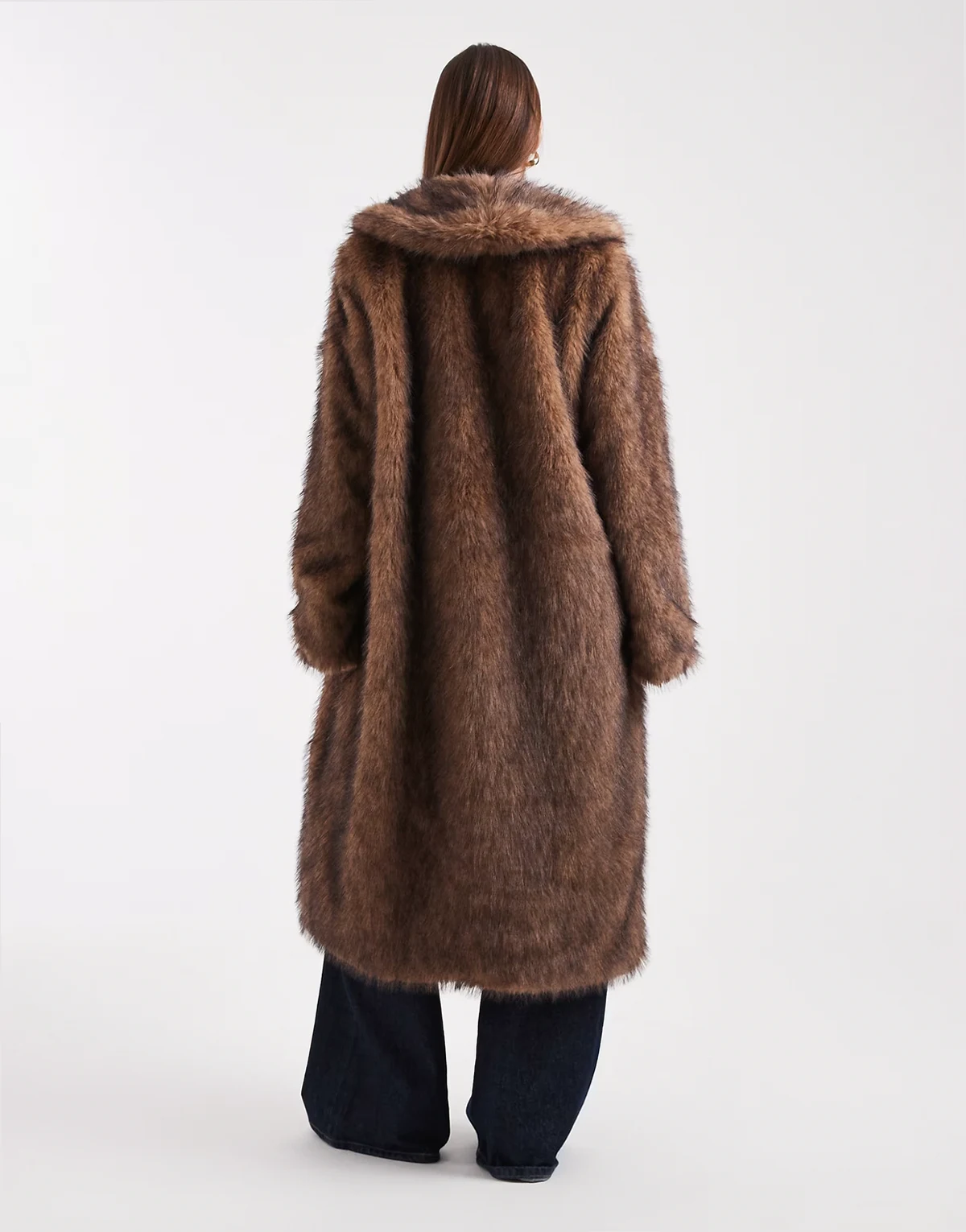 – Brązowy płaszcz maxi ze sztucznego futra