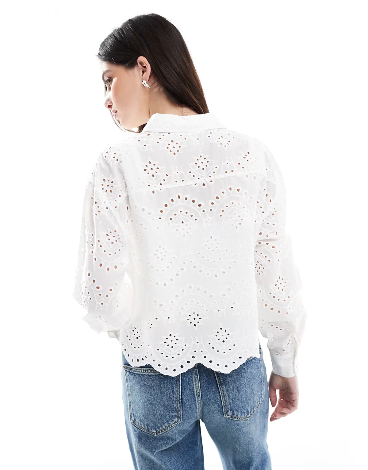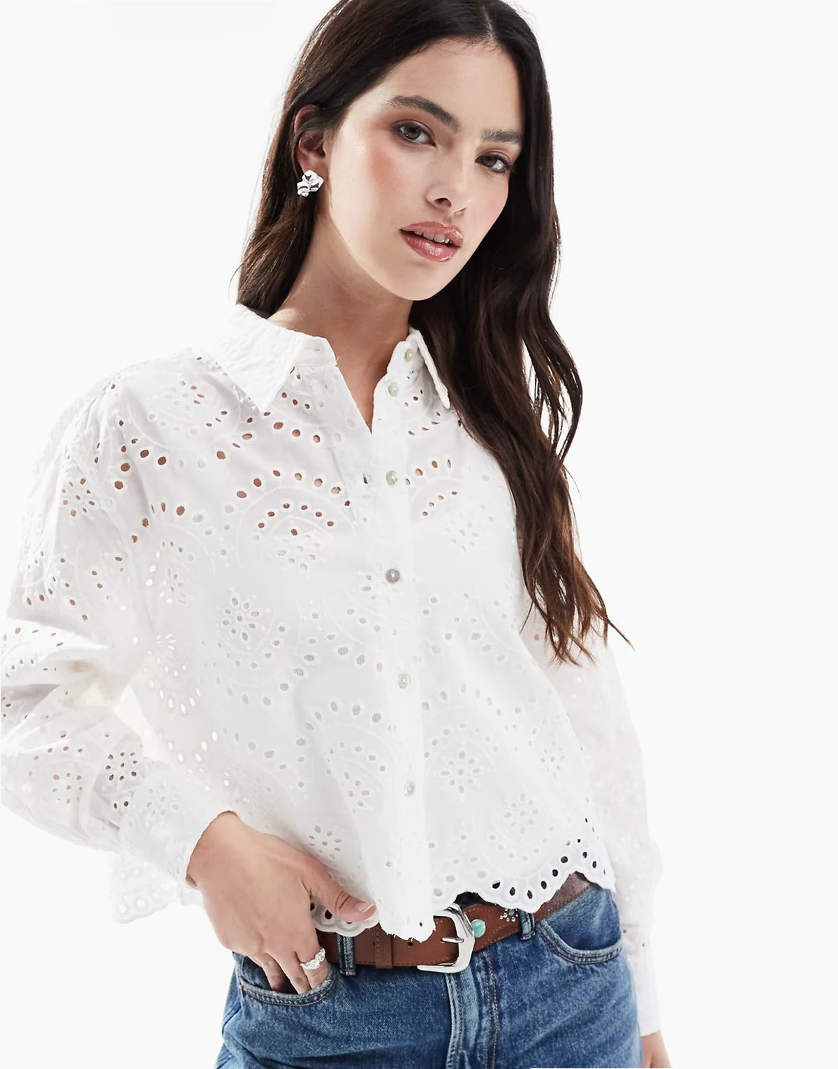 – Biała ażurowa koszula o krótkim fasonie