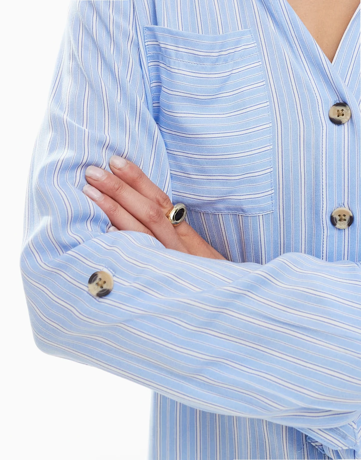– Kopertowa koszula w prążki z rękawami typu kokon