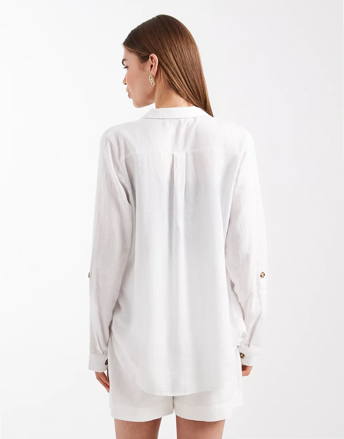 – Biała koszula z domieszką lnu w stylu utility z kieszeniami z przodu