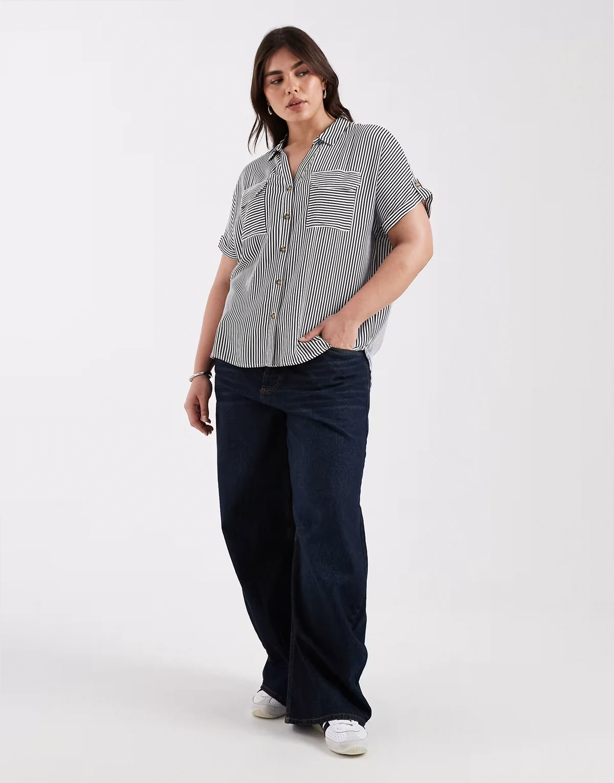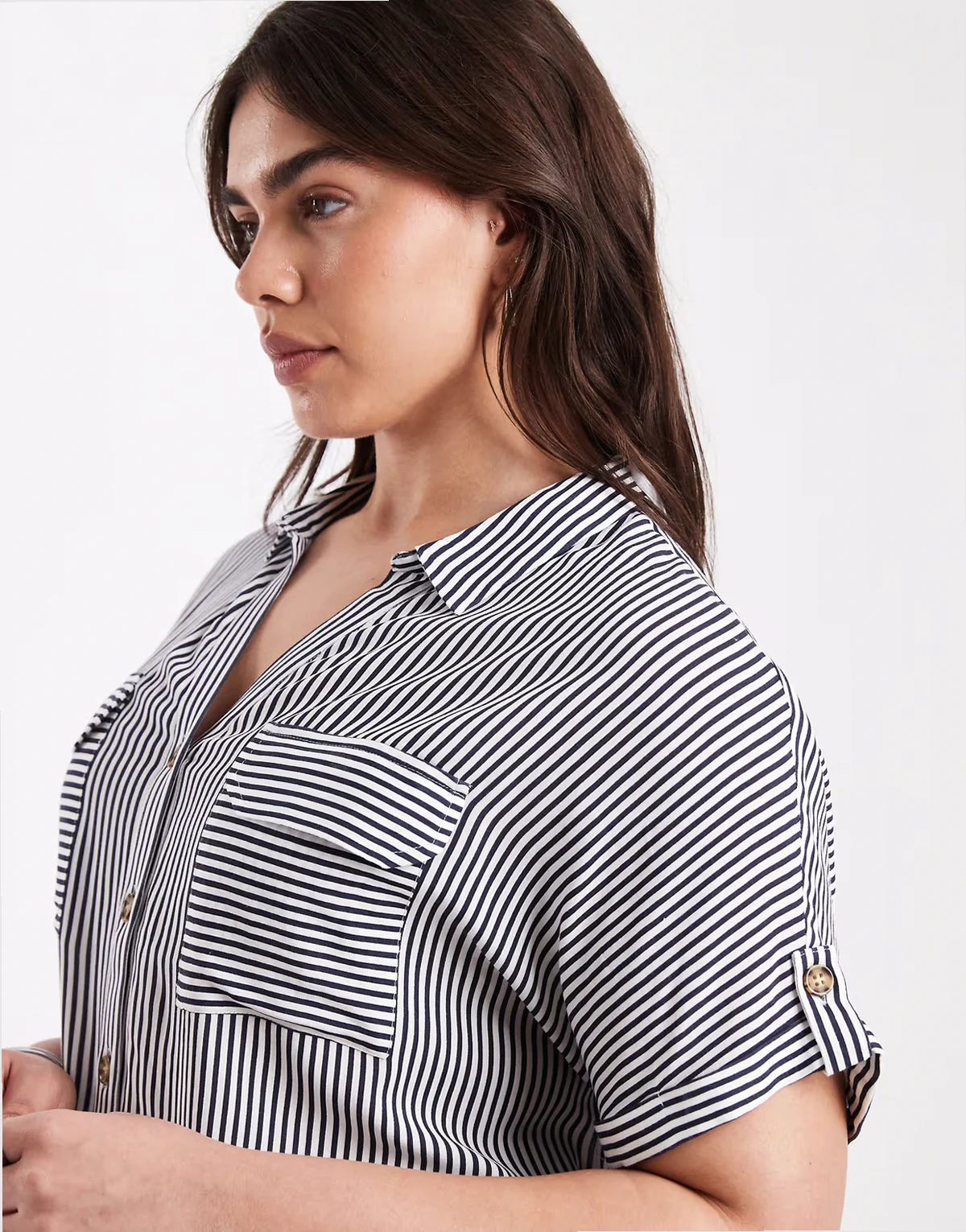 – Granatowo-biała koszula w paski z krótkimi rękawami, zapięciem na guziki z przodu i kieszenią
