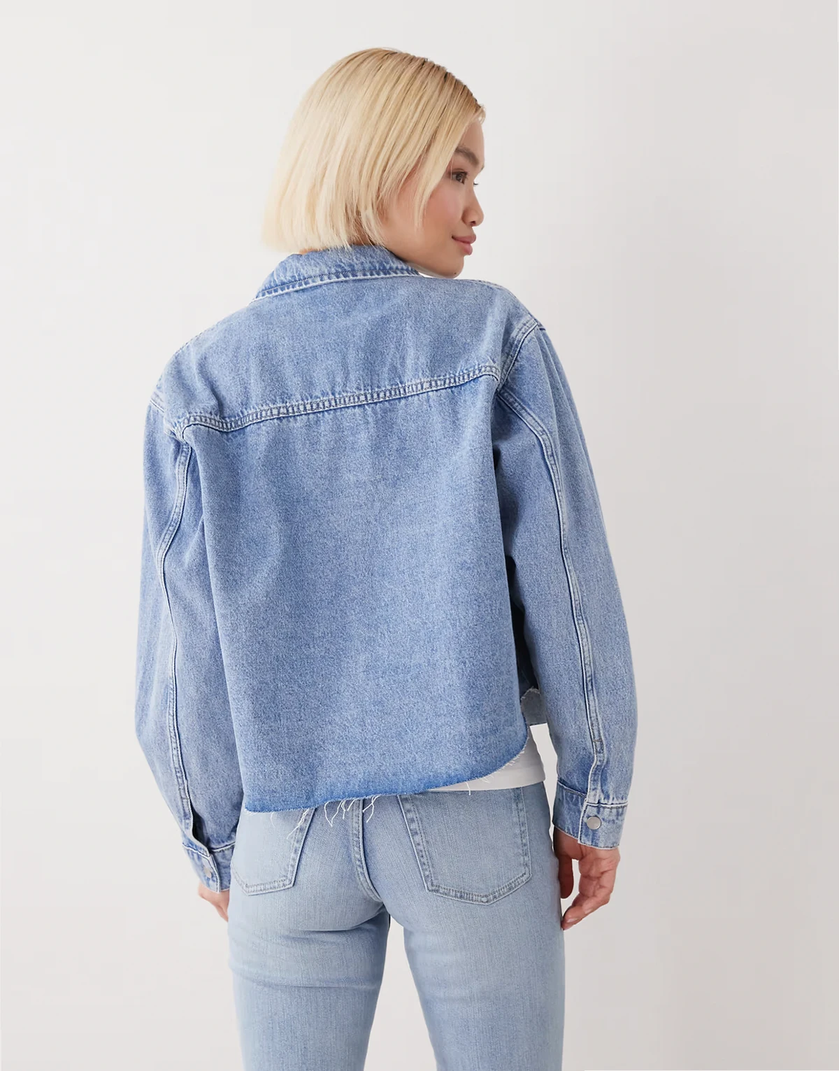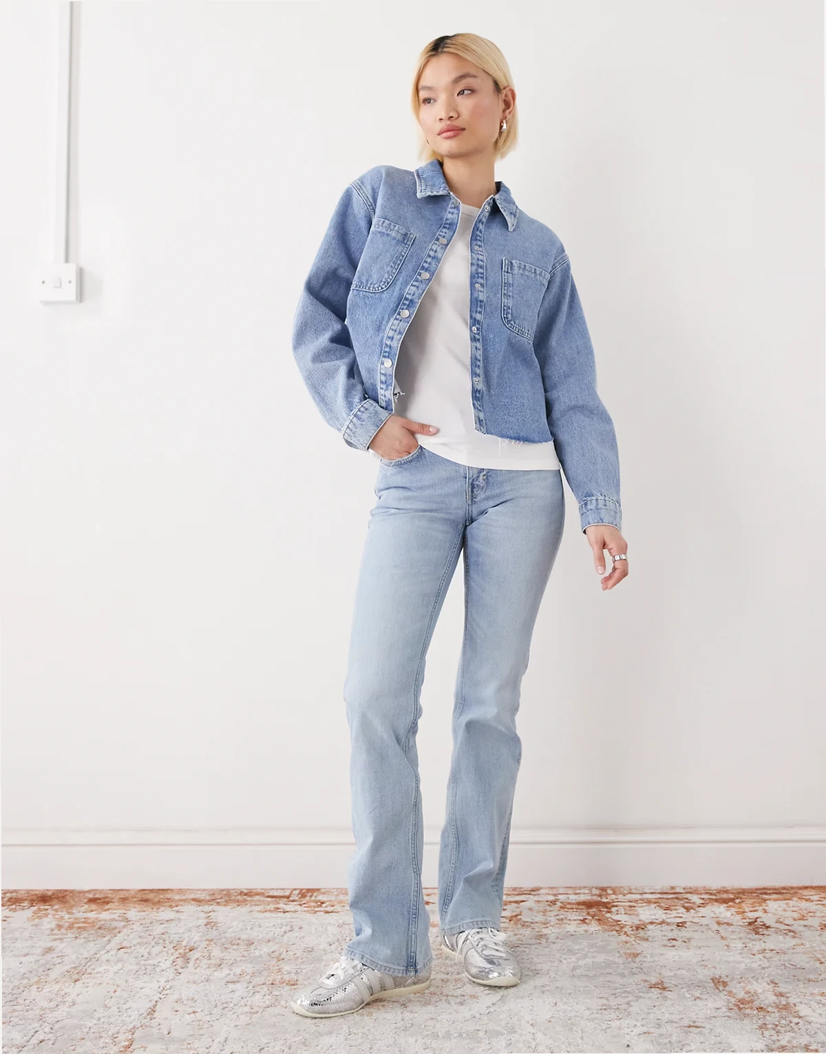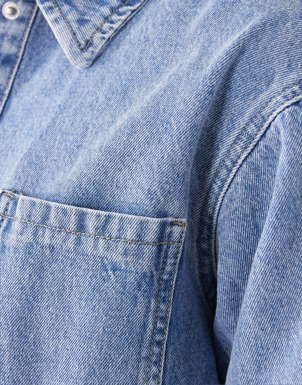 – Jasnoniebieska koszula jeansowa o pudełkowym kroju z surowym wykończeniem