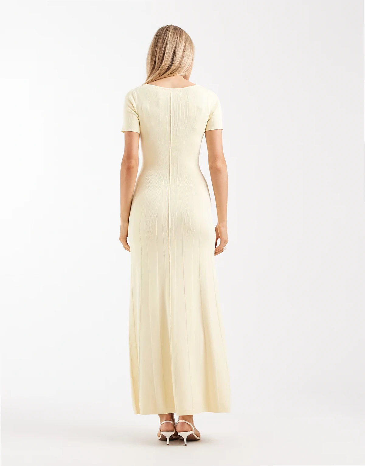 4th& Reckless – Cytrynowa sukienka maxi z dzianiny o delikatnym splocie z dekoltem w kształcie litery V i ozdobnym szwem z przodu