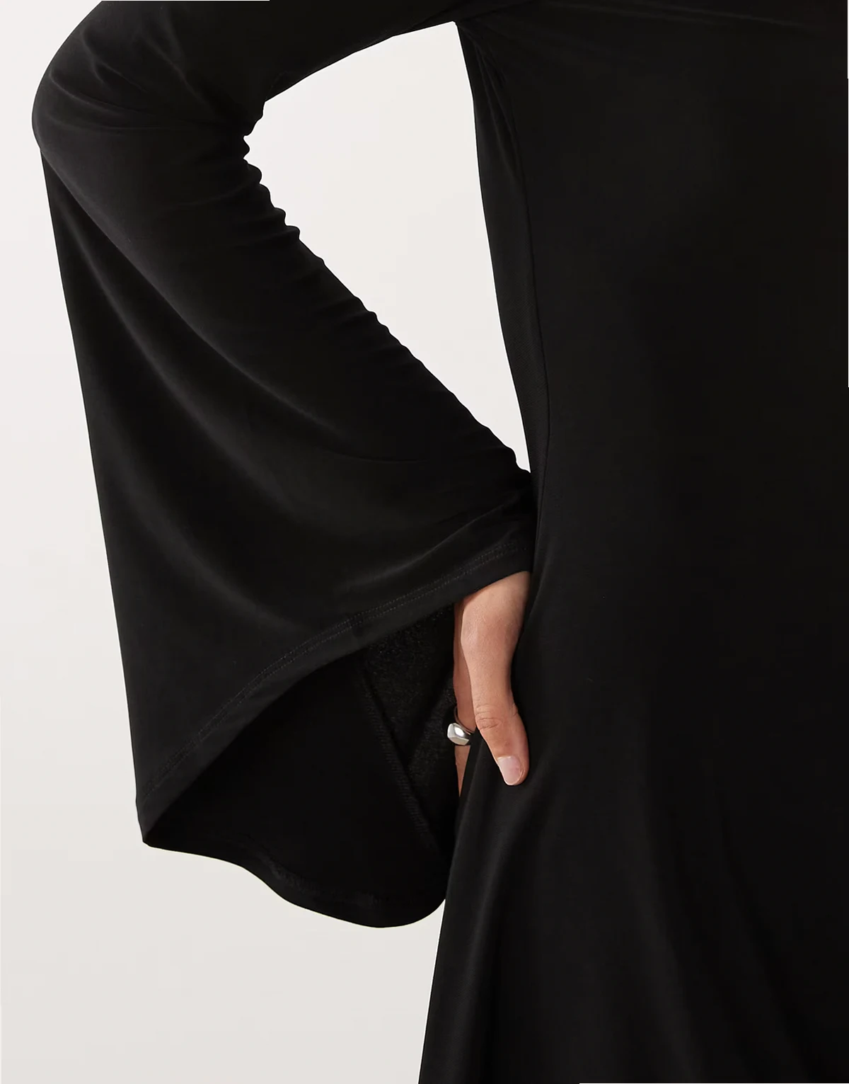 – Czarna zwiewna sukienka mini z rozkloszowanymi rękawami i dekoltem w kształcie serca
