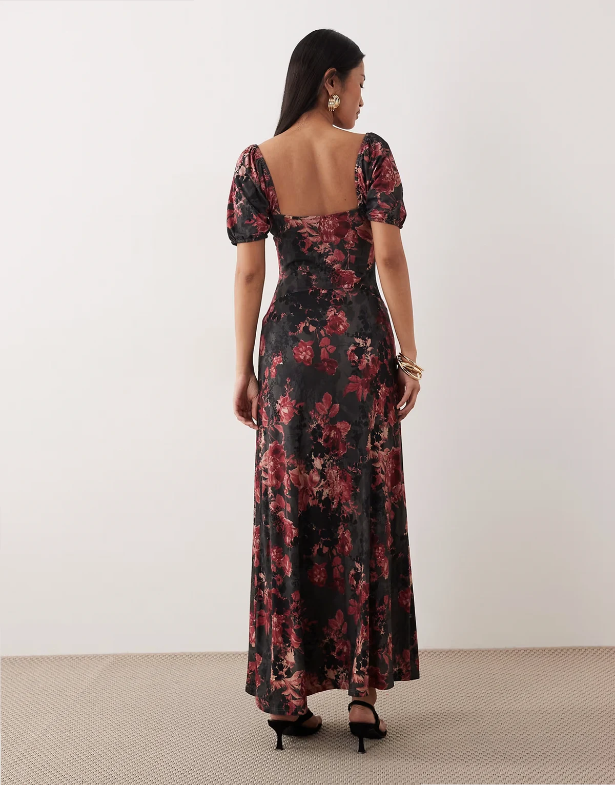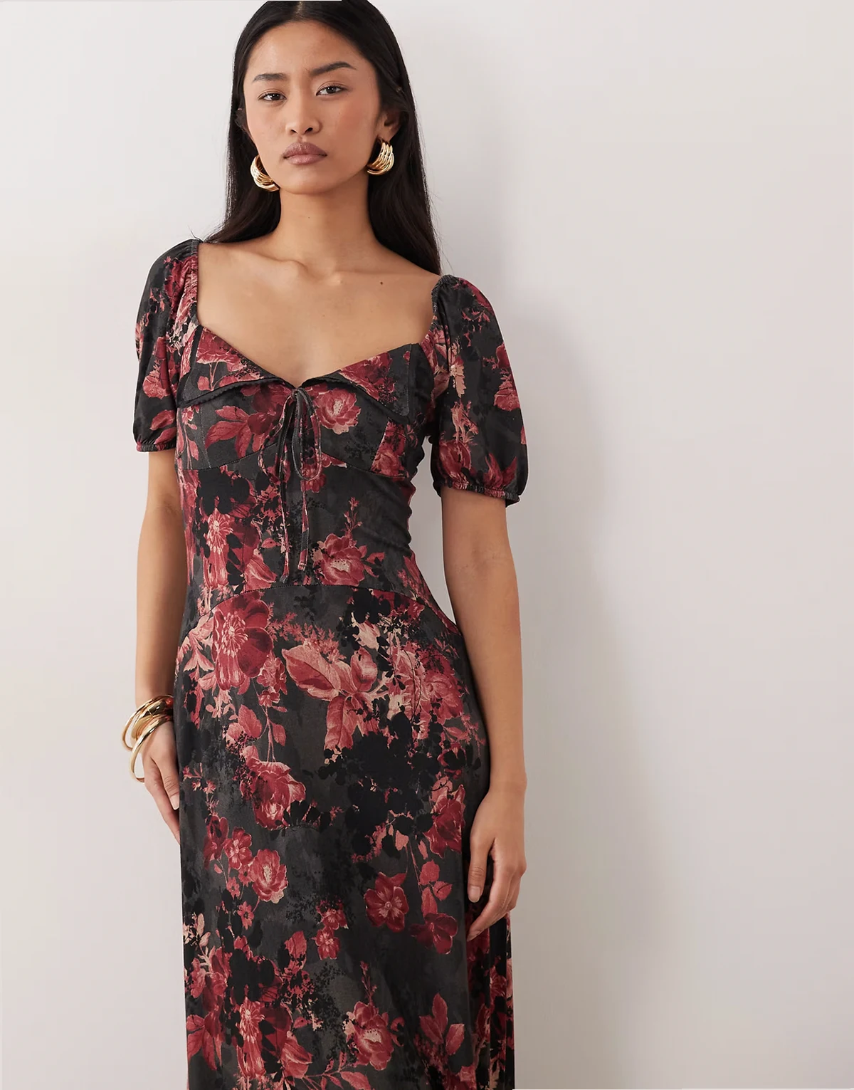– Czarna sukienka midi w kwiaty z bufkami, ozdobnymi przeszyciami i kołnierzem o muszelkowym wykończeniu