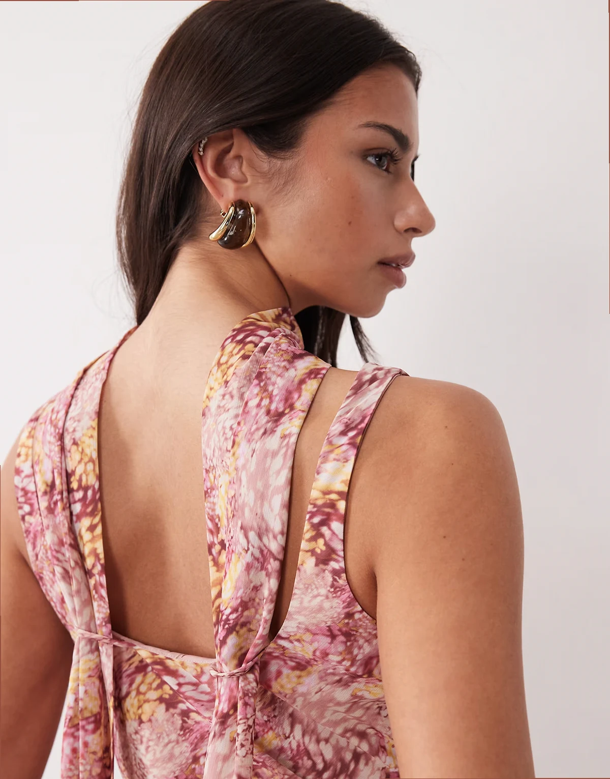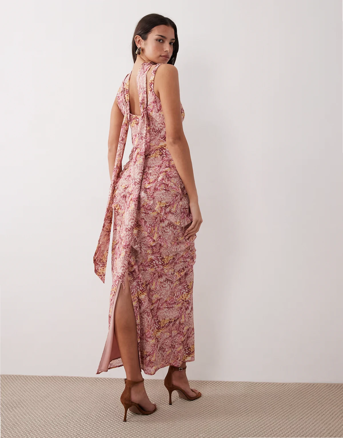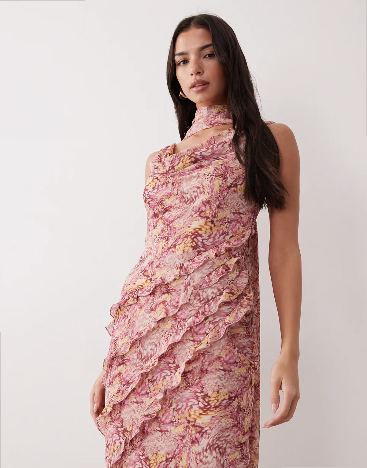 4. – Sukienka maxi z szalem, falbankami i rozcięciem z przodu w abstrakcyjny jagodowy wzór