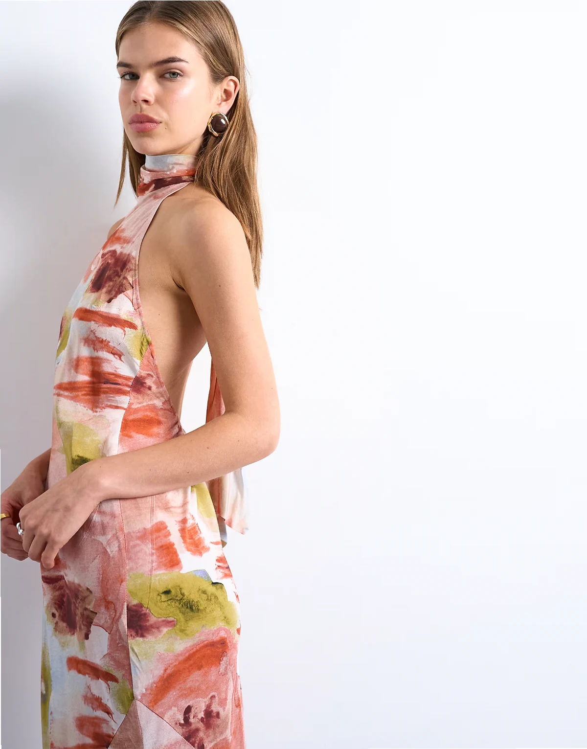 – Beżowa sukienka midi z zabudowanym dekoltem w typu halter w abstrakcyjny kwiatowy wzór