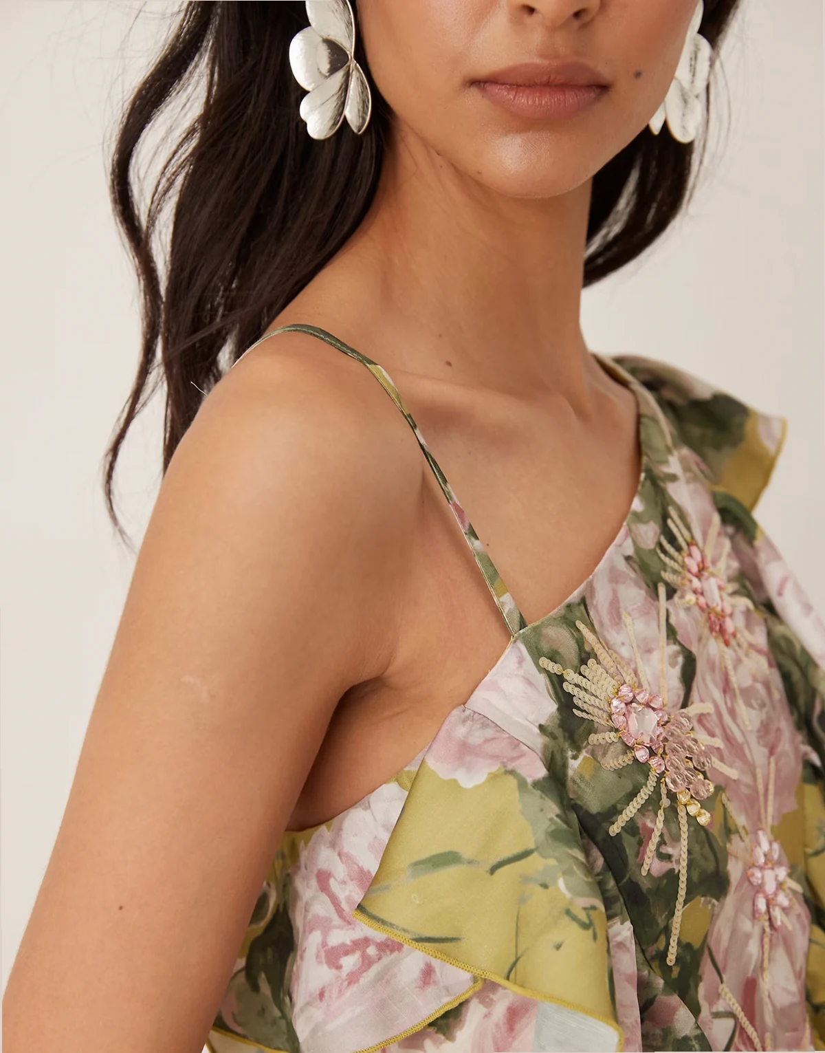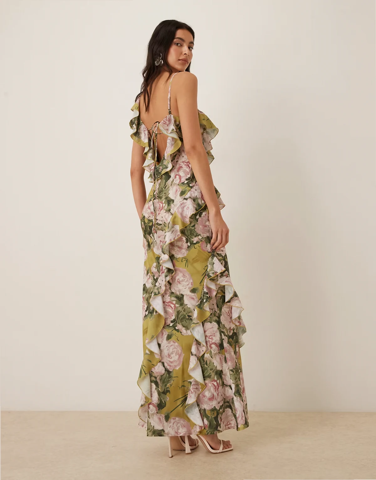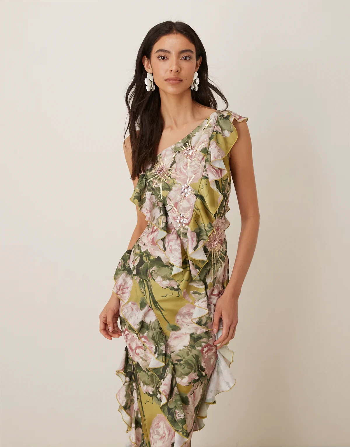 – Zielona satynowa sukienka asymetryczna maxi na jedno ramię z falbankami i zdobieniem w kwiatowy wzór