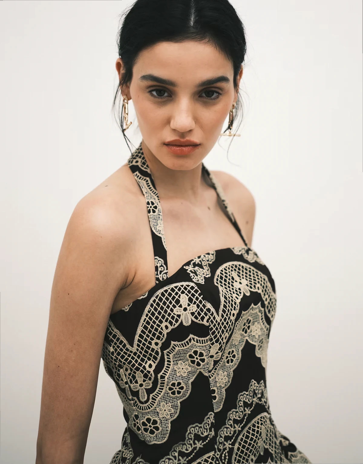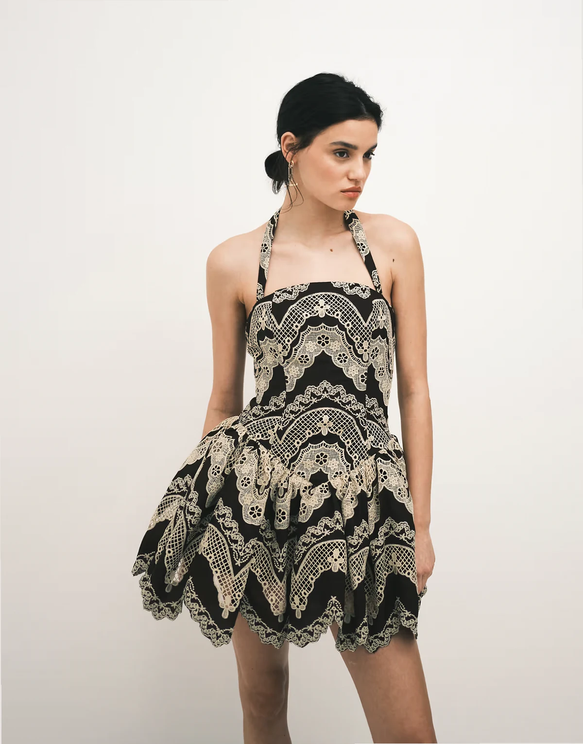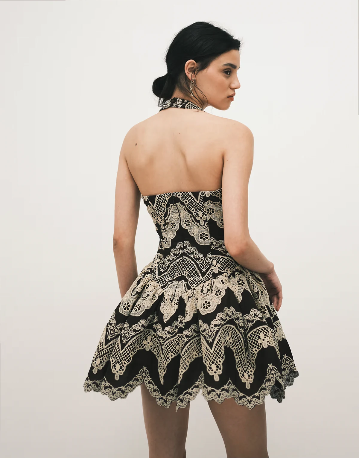 – Brązowa koronkowa sukienka mini z dekoltem halter i haftowanym wzorem
