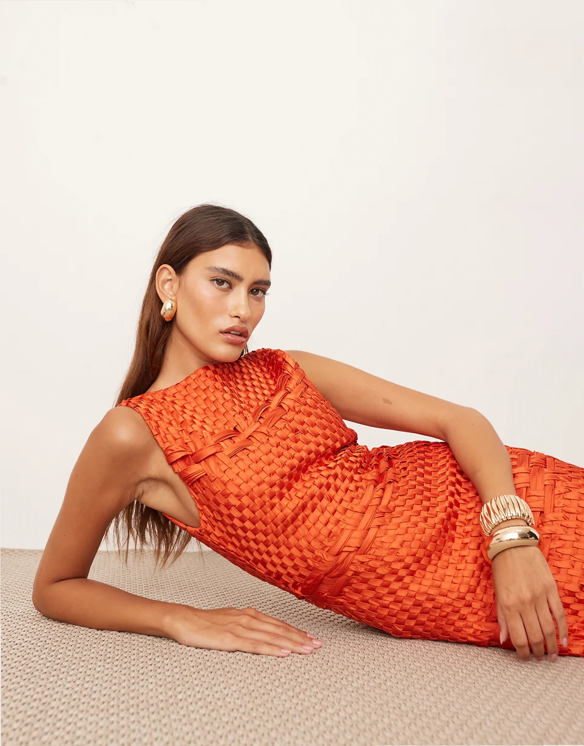 4. Pomarańczowa pleciona sukienka midi z frędzlami