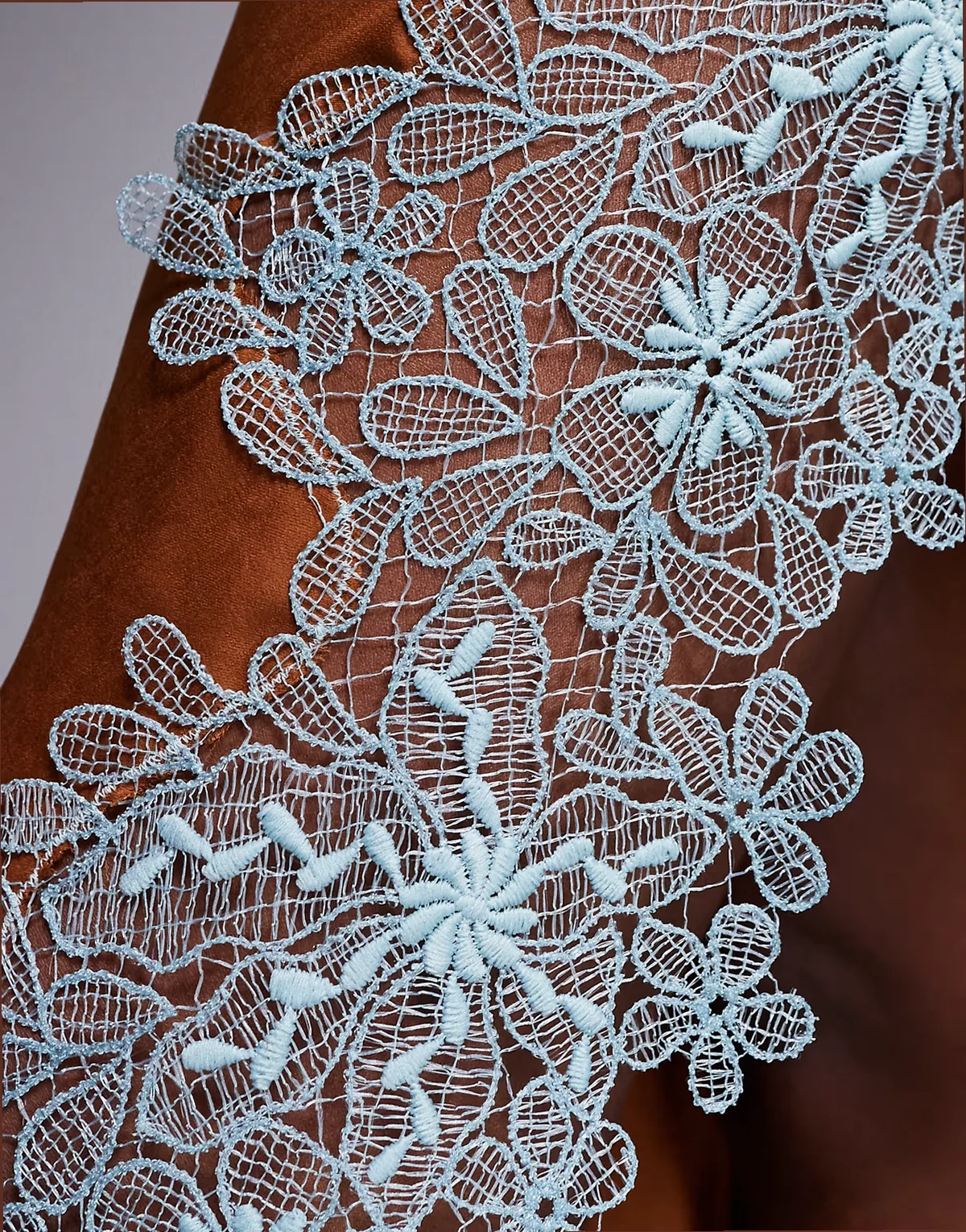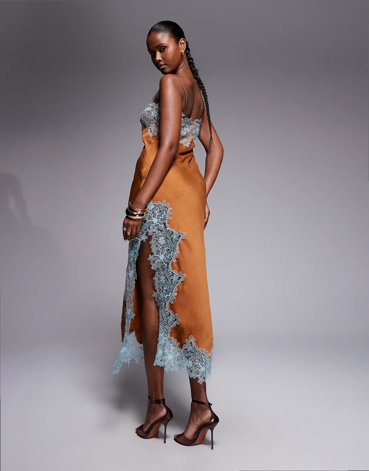 – Brązowo-niebieska satynowa sukienka midi na ramiączkach ze skosu z koronkową aplikacją