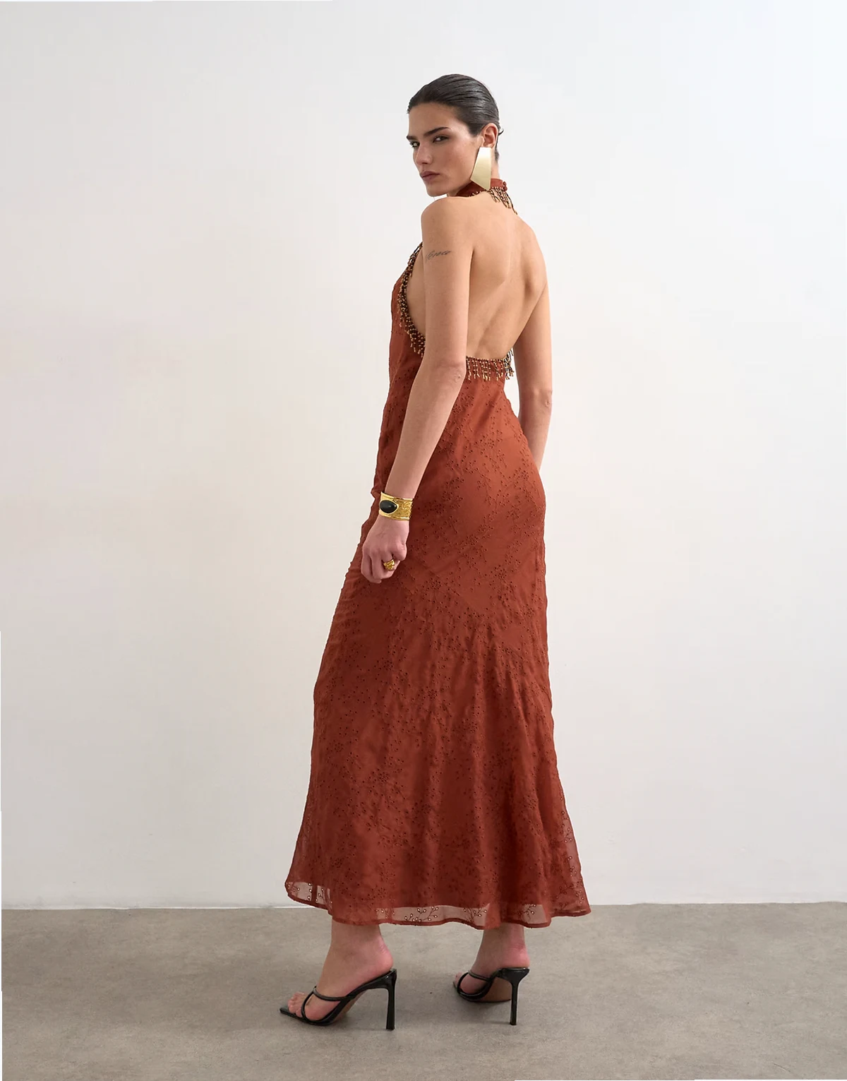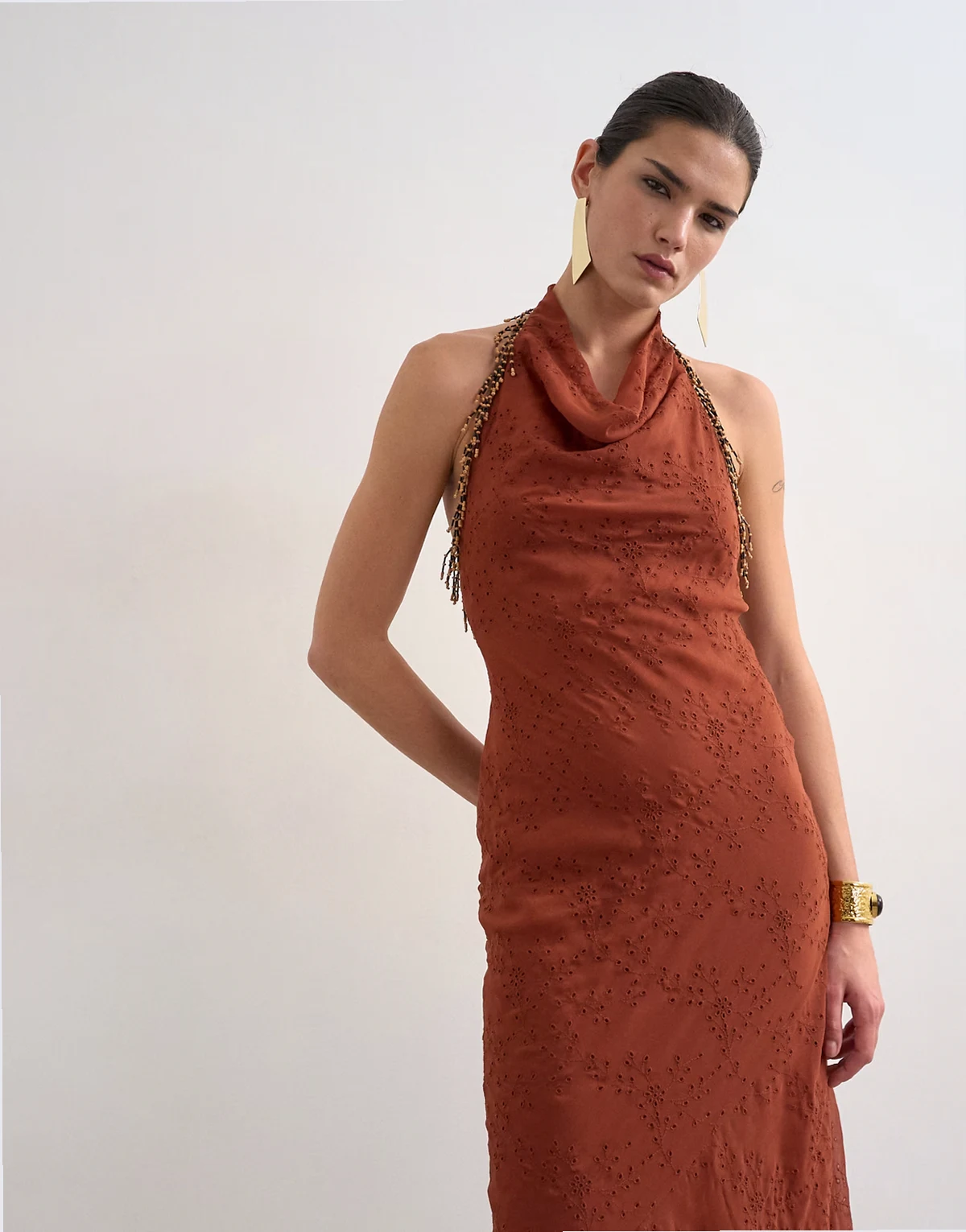 Ta sukienka została wykonana z materiału z haftem angielskim. Ma dekolt typu halter, zapięcie na guziki, odkryte plecy, zdobienie z koralików i regularny krój.
