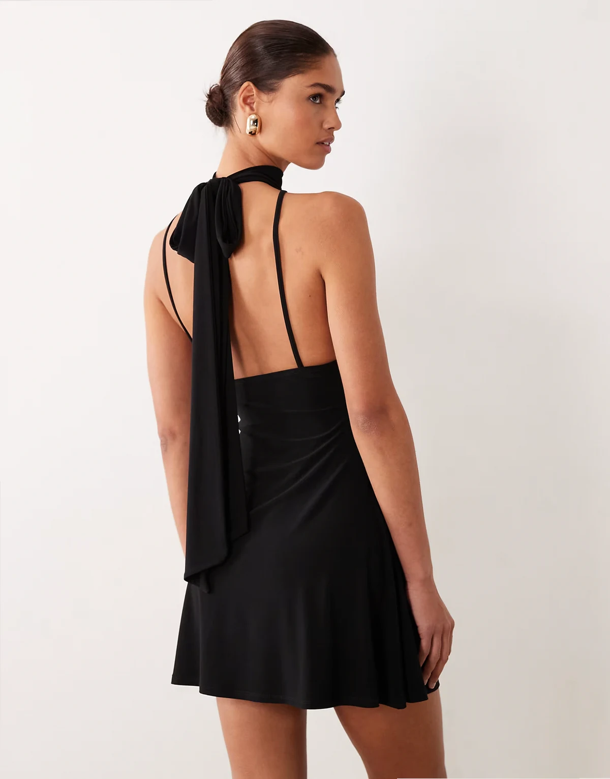 4. – Czarna zwiewna sukienka mini z odkrytymi plecami i szalem