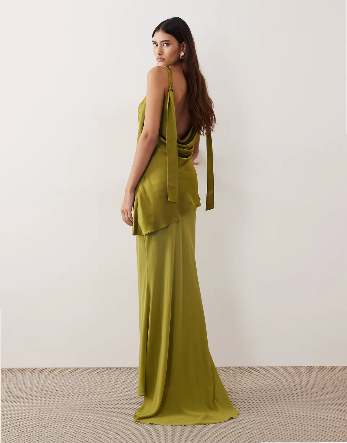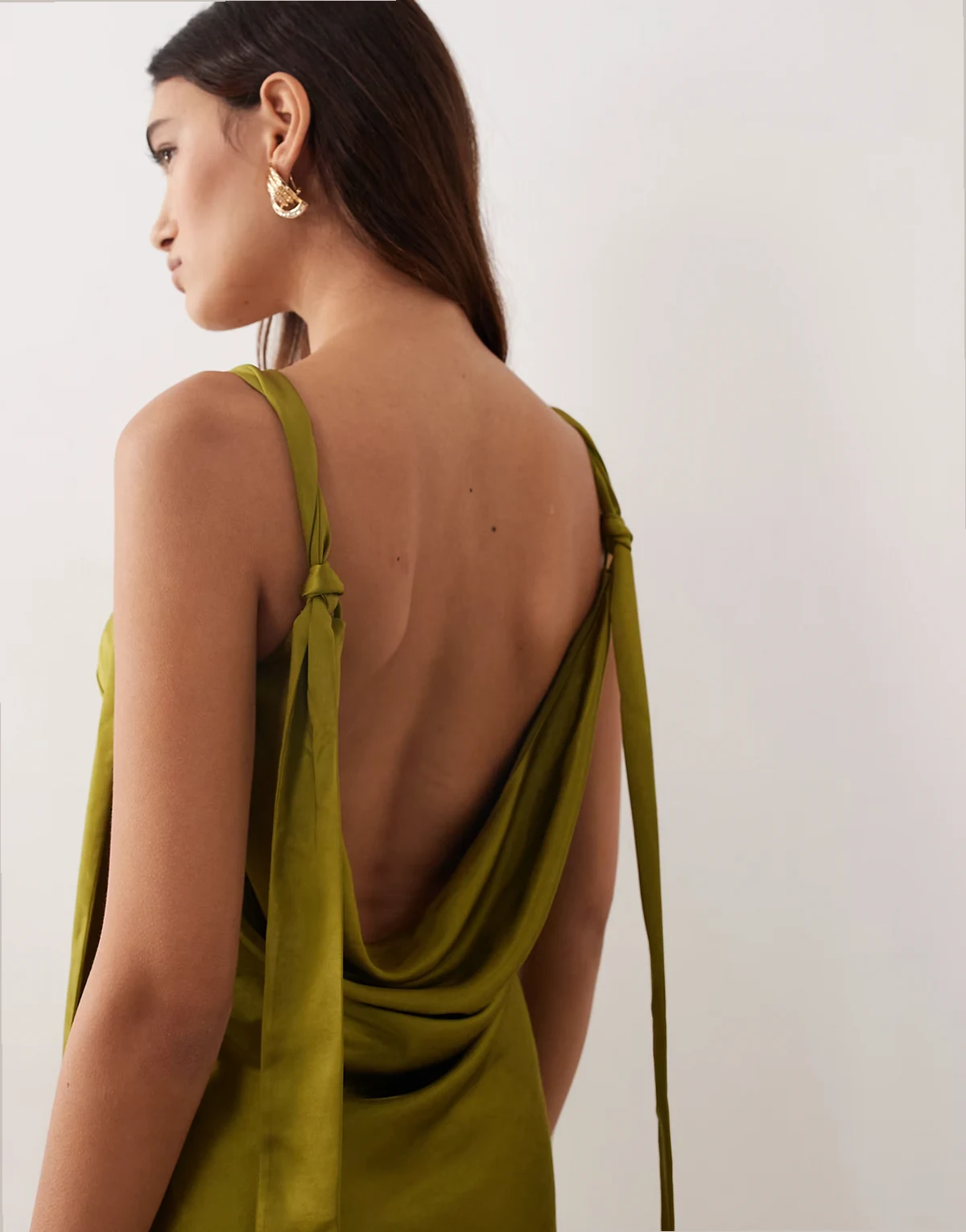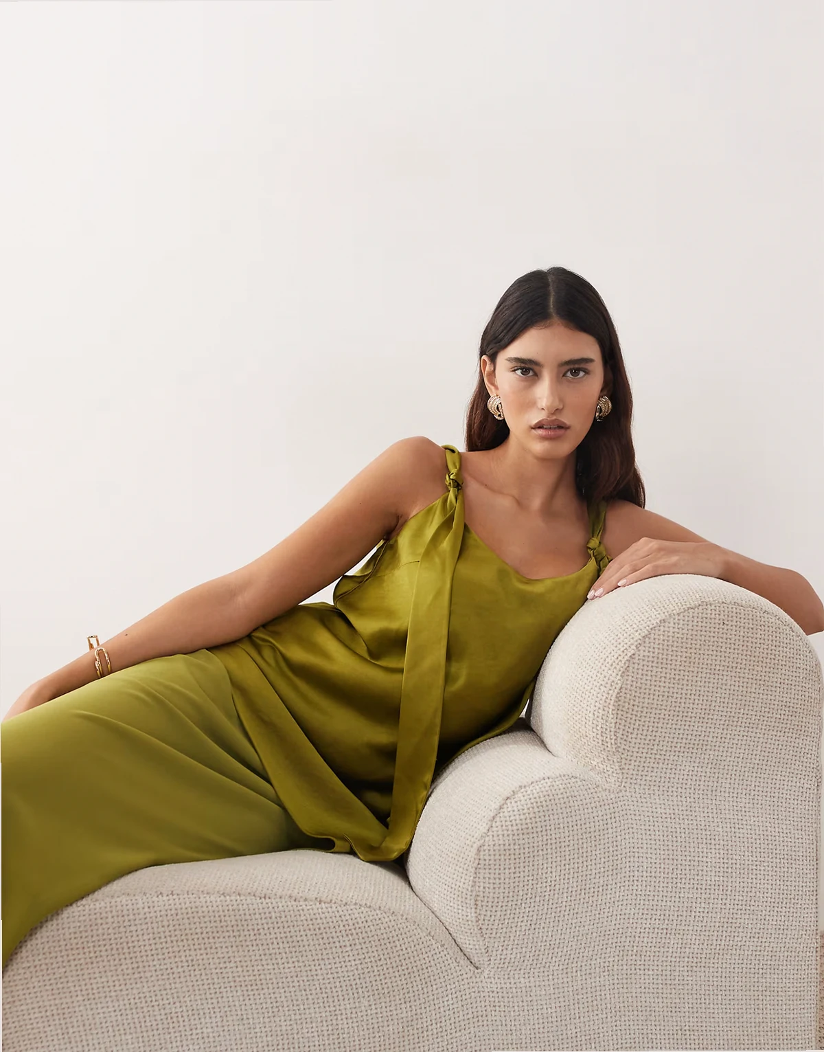 – Oliwkowozielona satynowa sukienka maxi z wiązaniem na ramionach