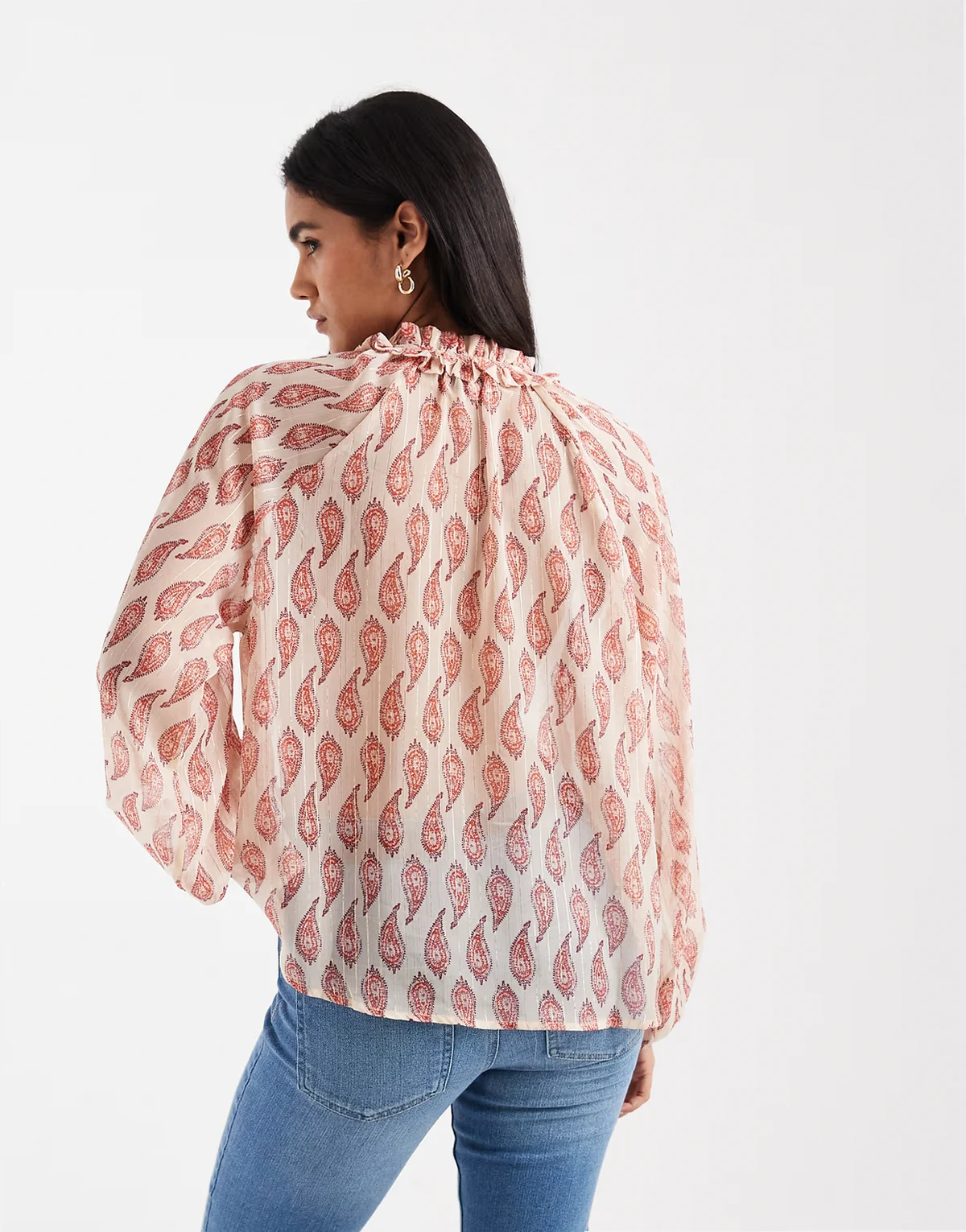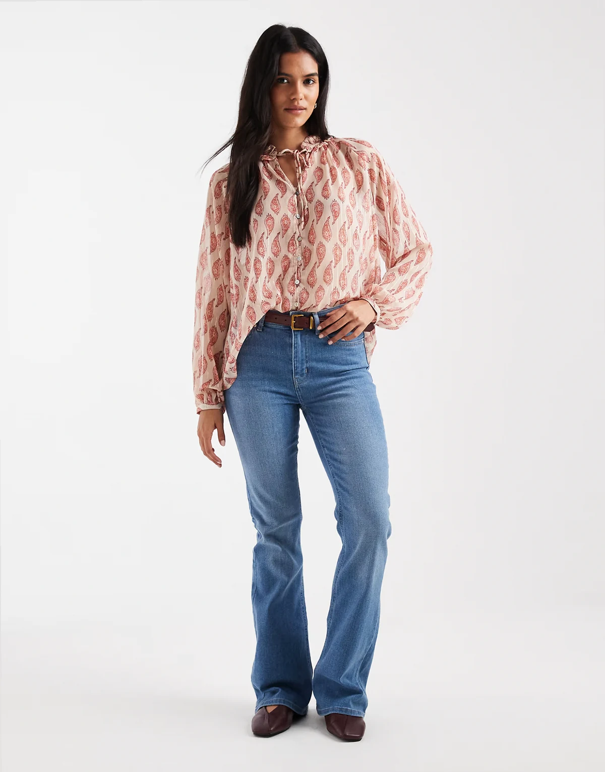 – Kremowa bluzka z obszernymi rękawami z obcisłym mankietem w stylu boho