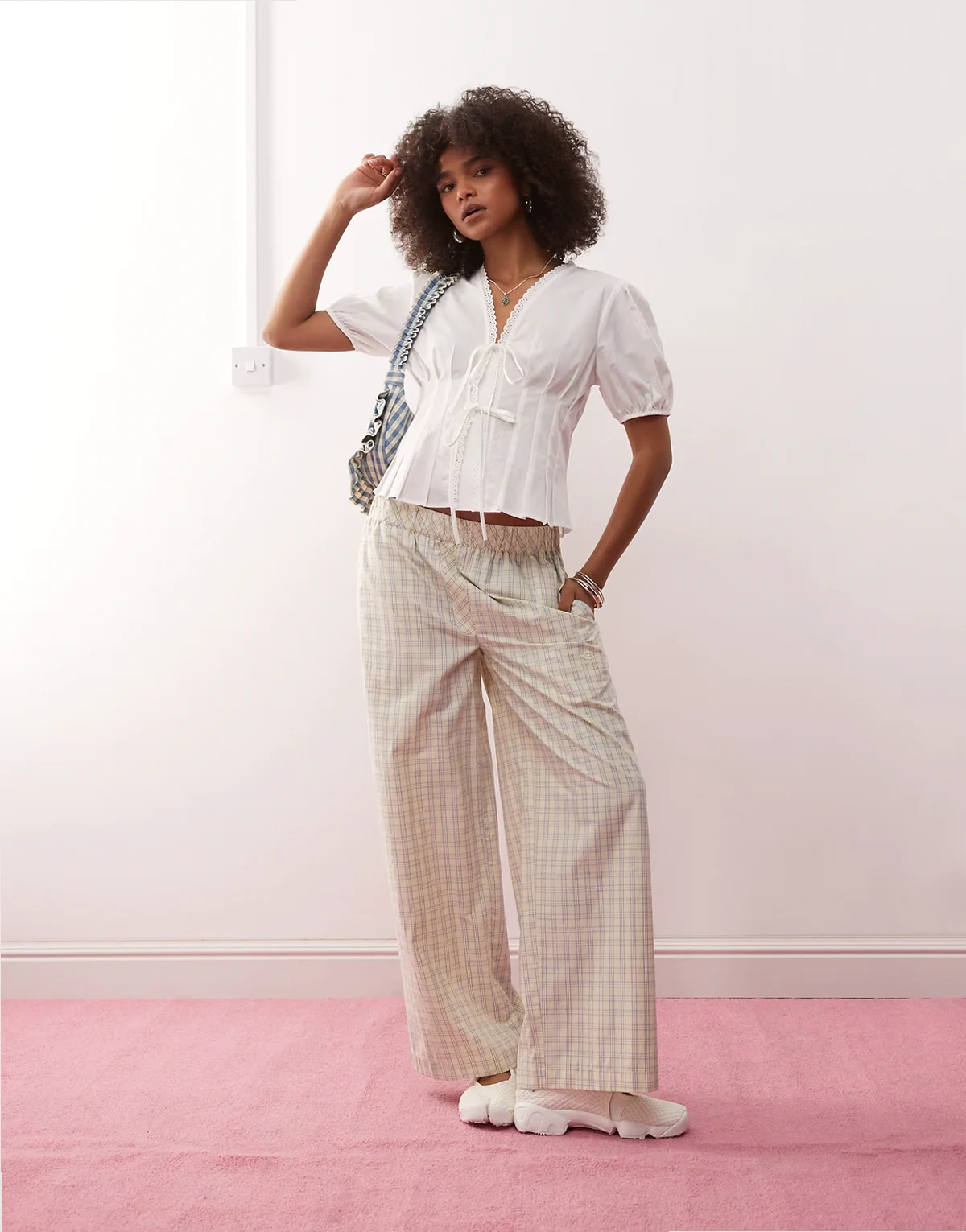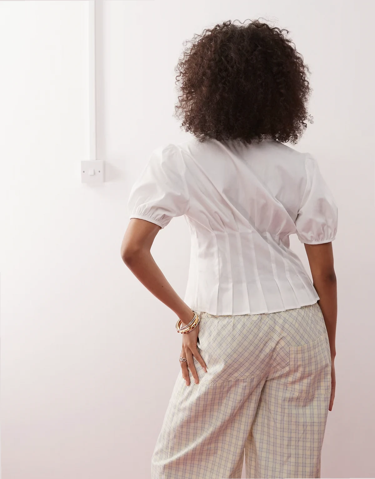 – Top z wiązaniem z przodu, bufkami i wcięciem w talii