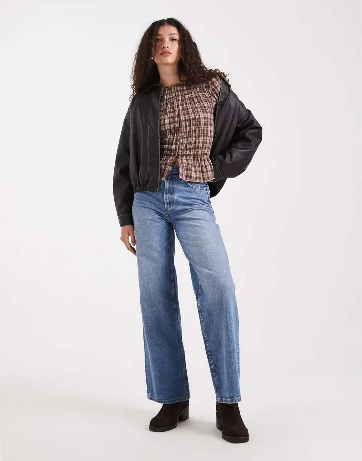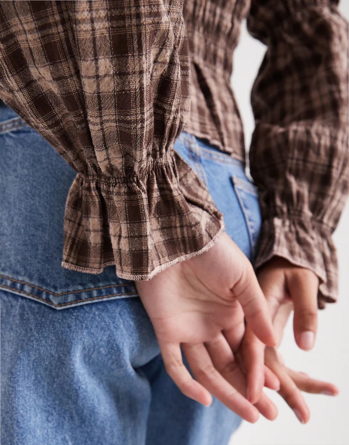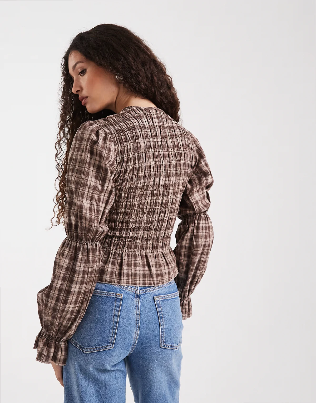 – Marszczona brązowa bluzka z długimi rękawami w kratkę
