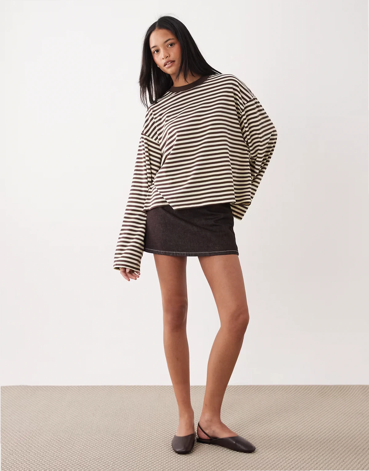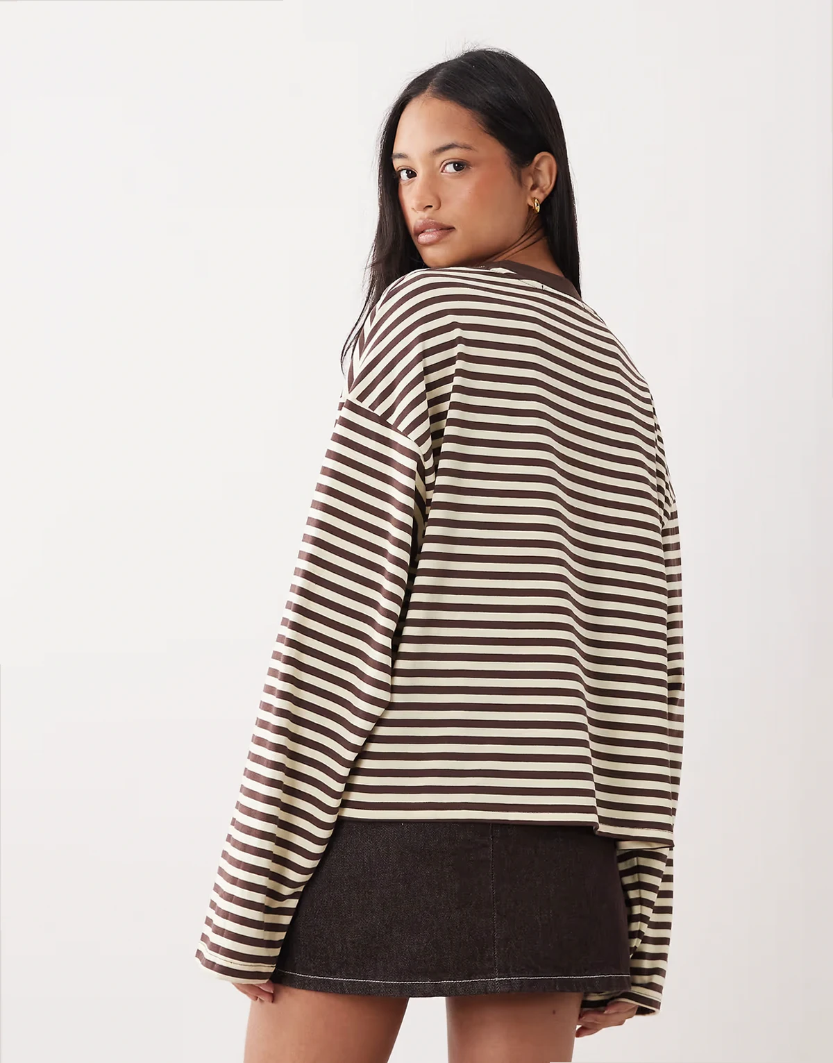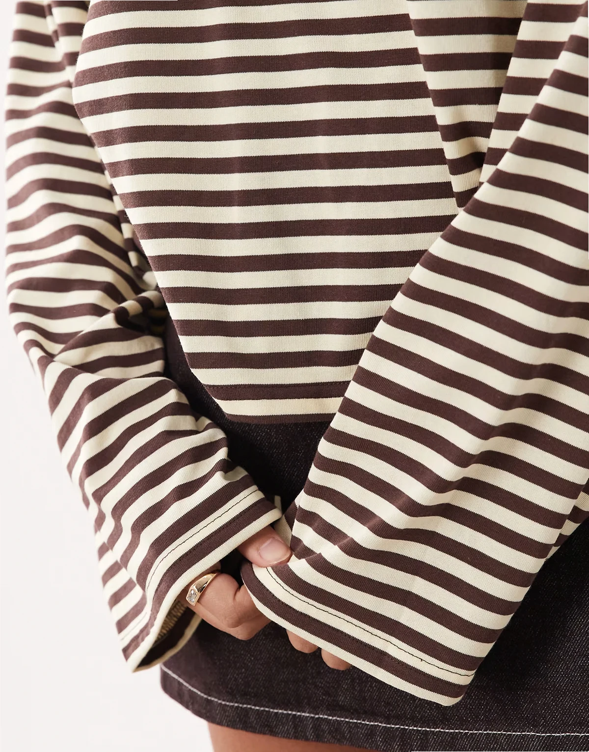– Bloom – Czekoladowo-cytrynowy pudełkowy T-shirt z długimi rękawami i okrągłym dekoltem z mieszanki bawełny w paski