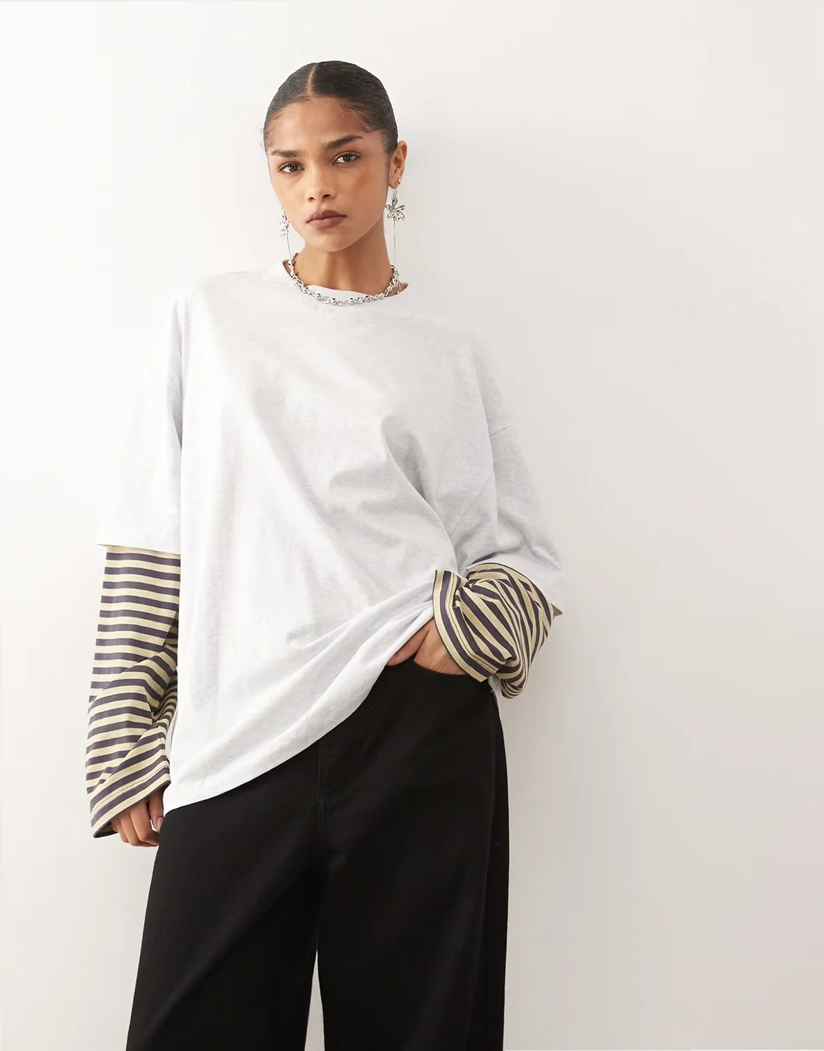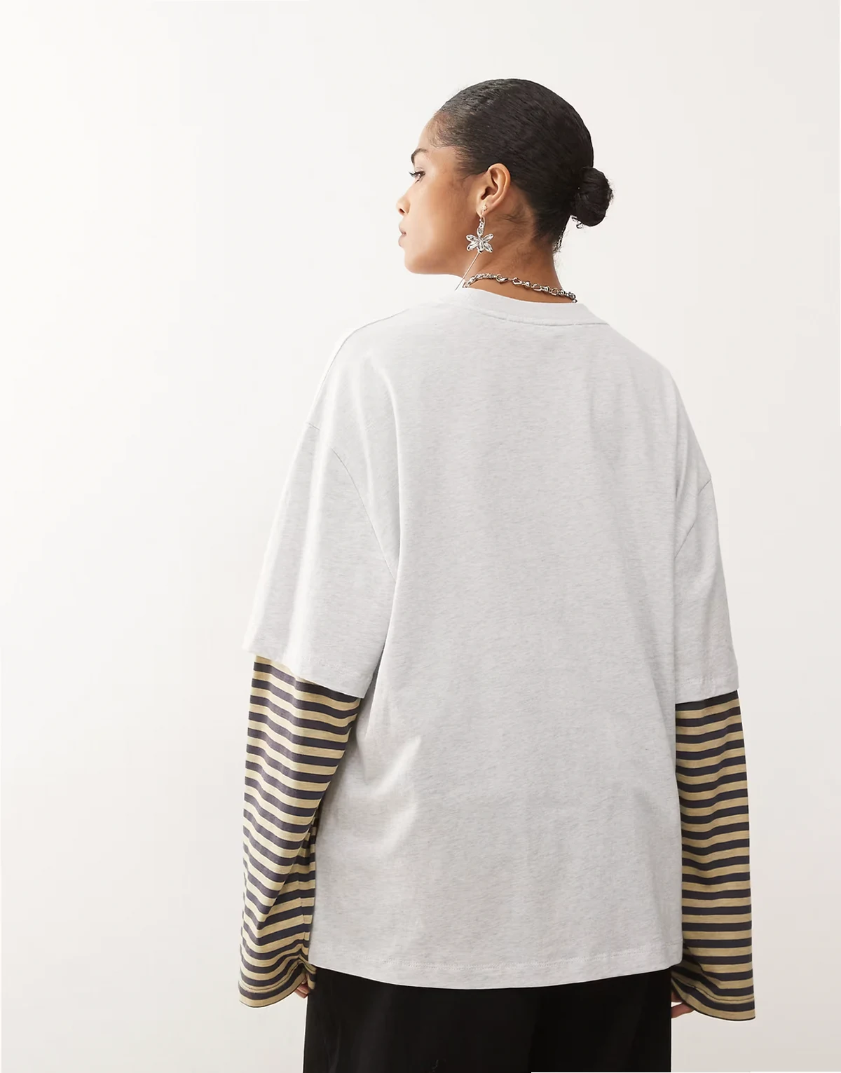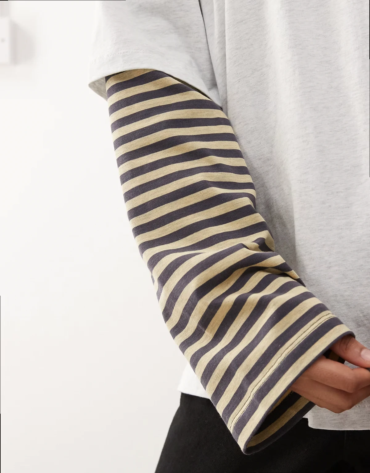 Exclusive – Bloom – T-shirt oversize 2 w 1 z długimi rękawami w szaro-beżowe paski