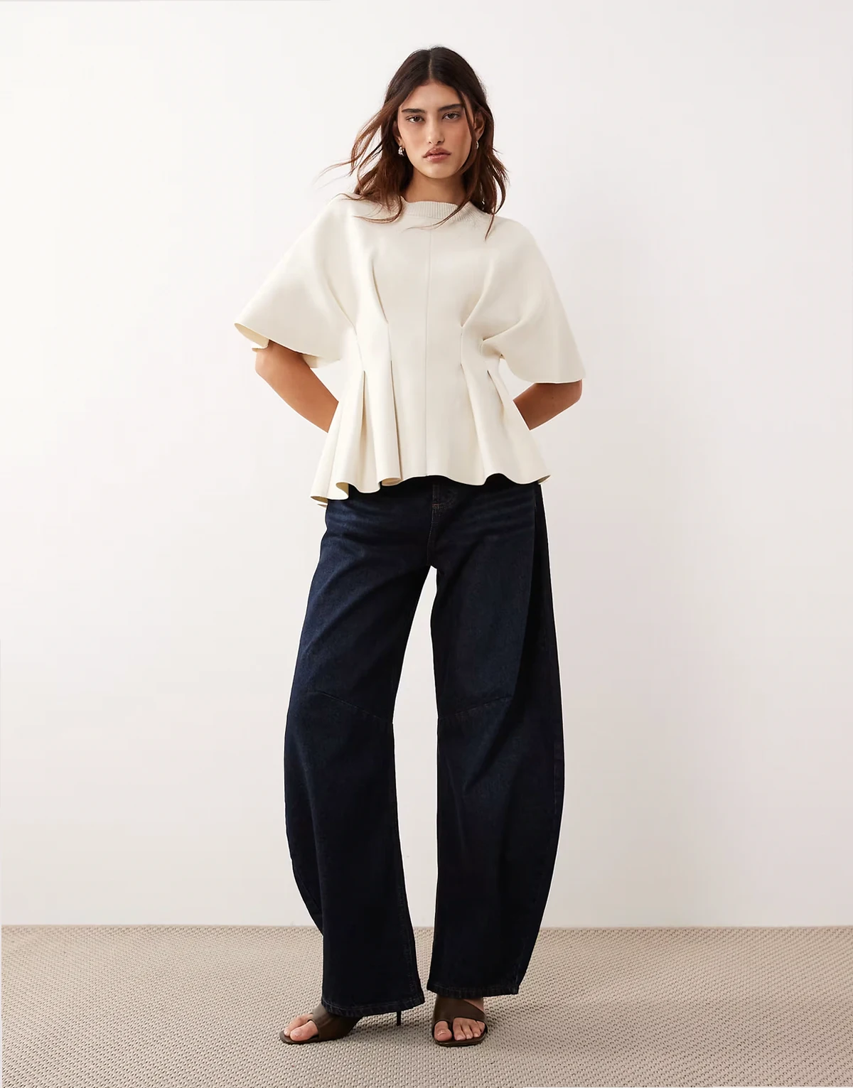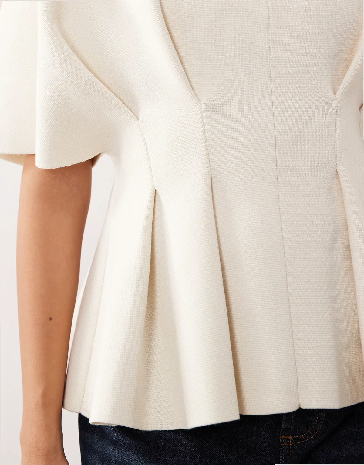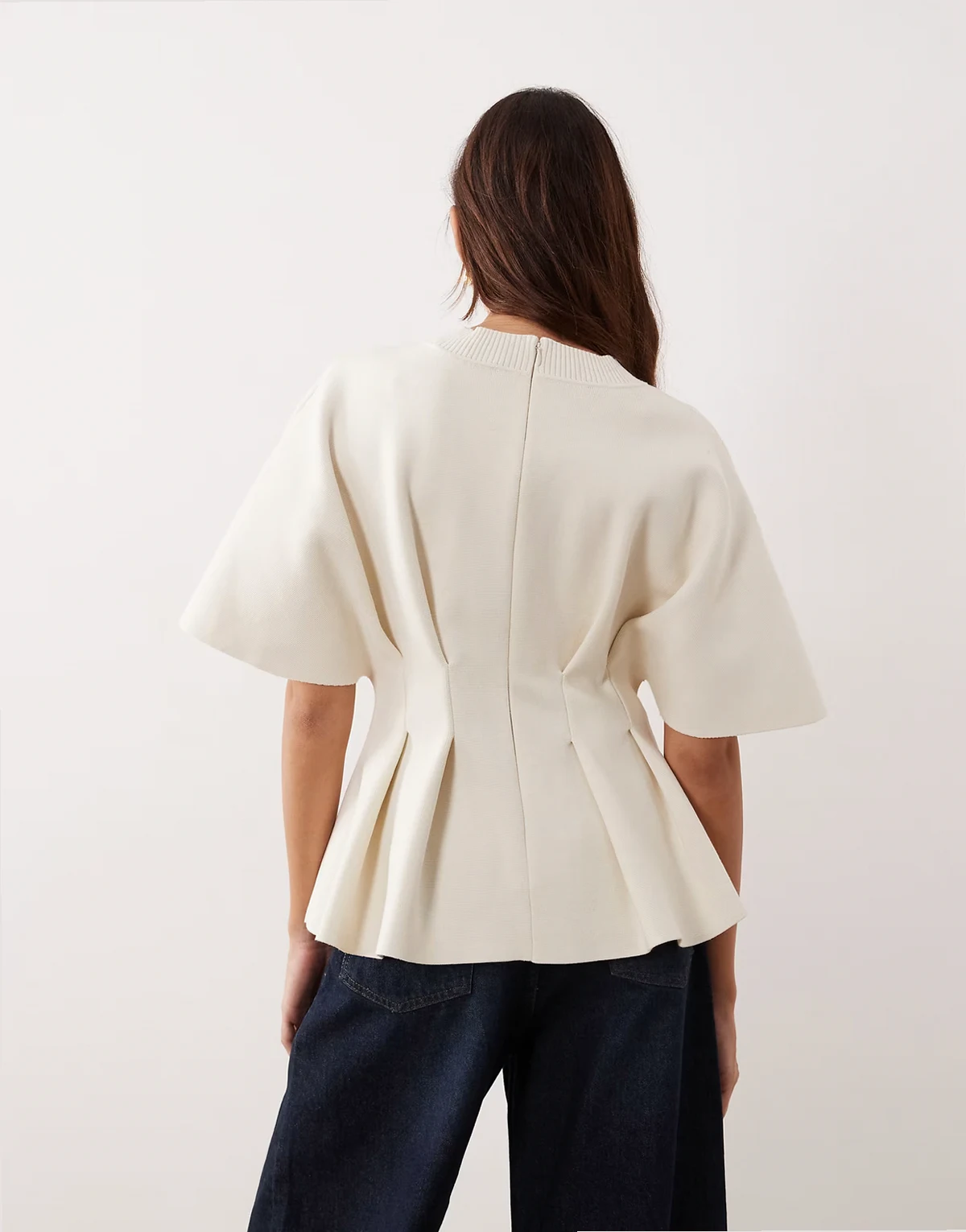 – Kremowy dzianinowy top z krótkim rękawem, taliowaniem i plisowaniem
