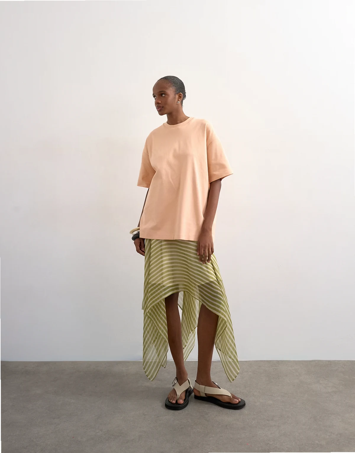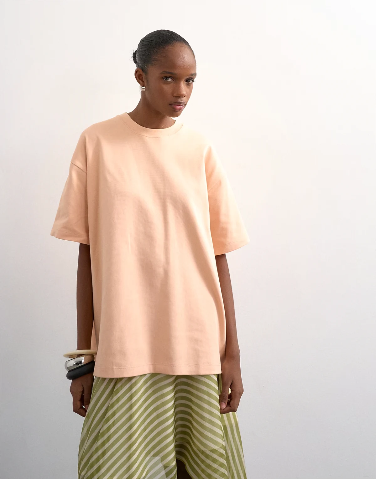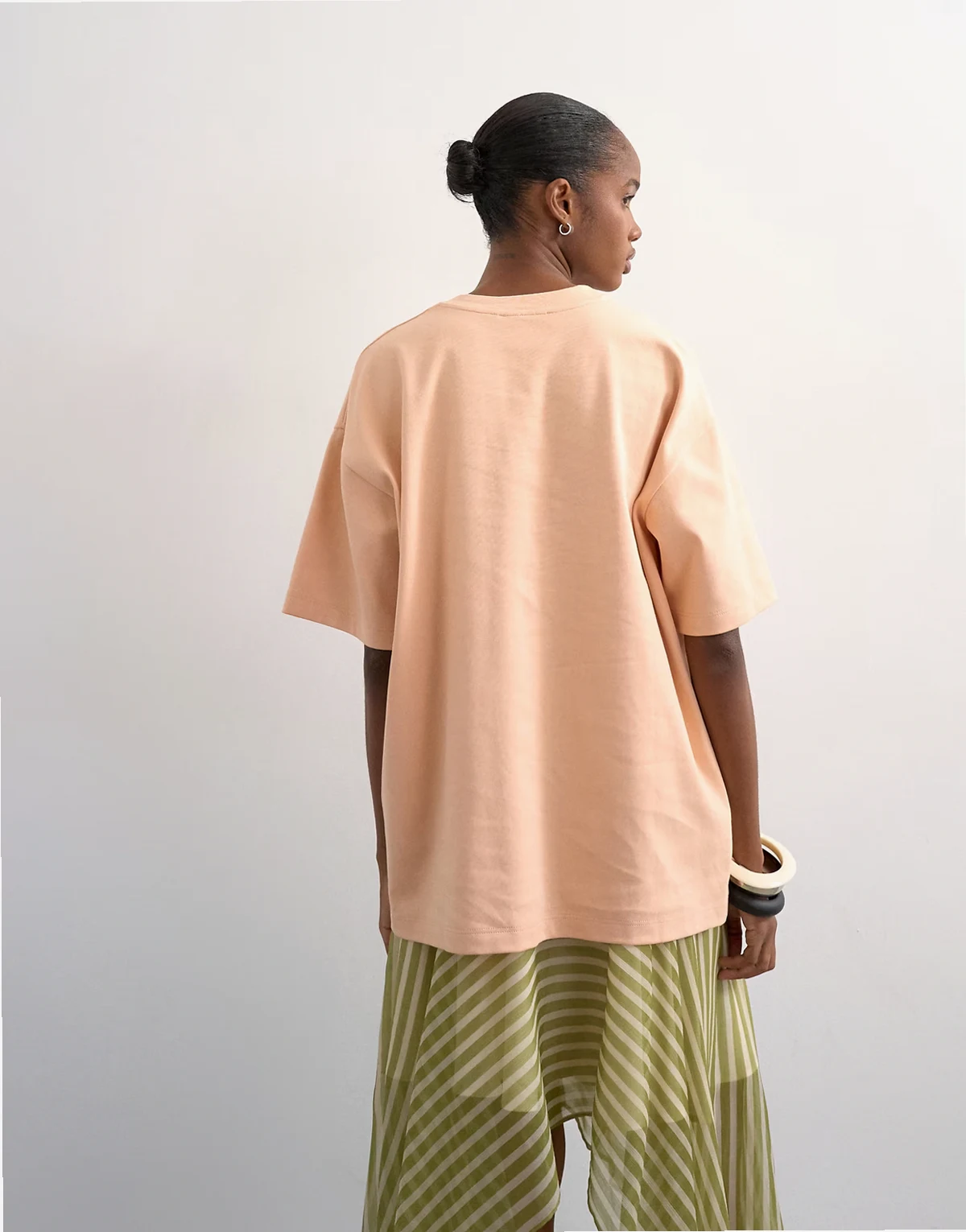 Ten T-shirt został wykonany z miękkiego, elastycznego materiału w odcieniu brzoskwiniowym. Ma okrągły dekolt i obniżoną linię ramion oraz fason oversize.