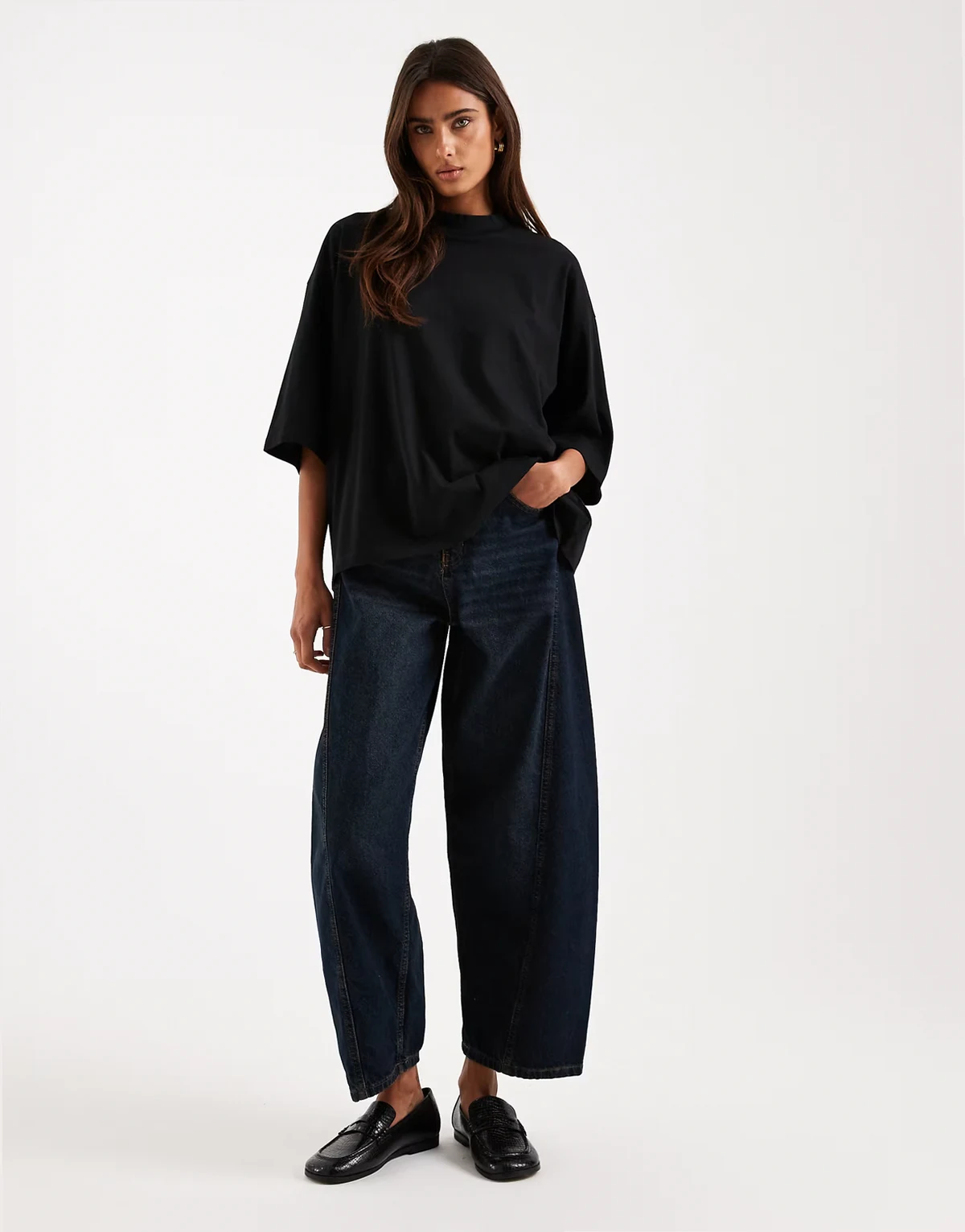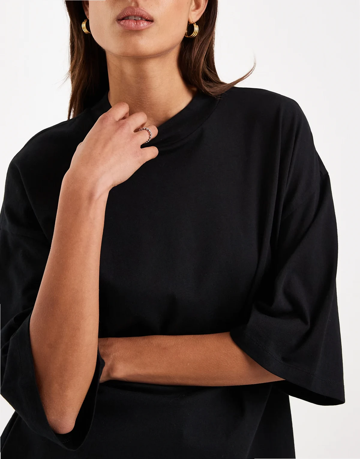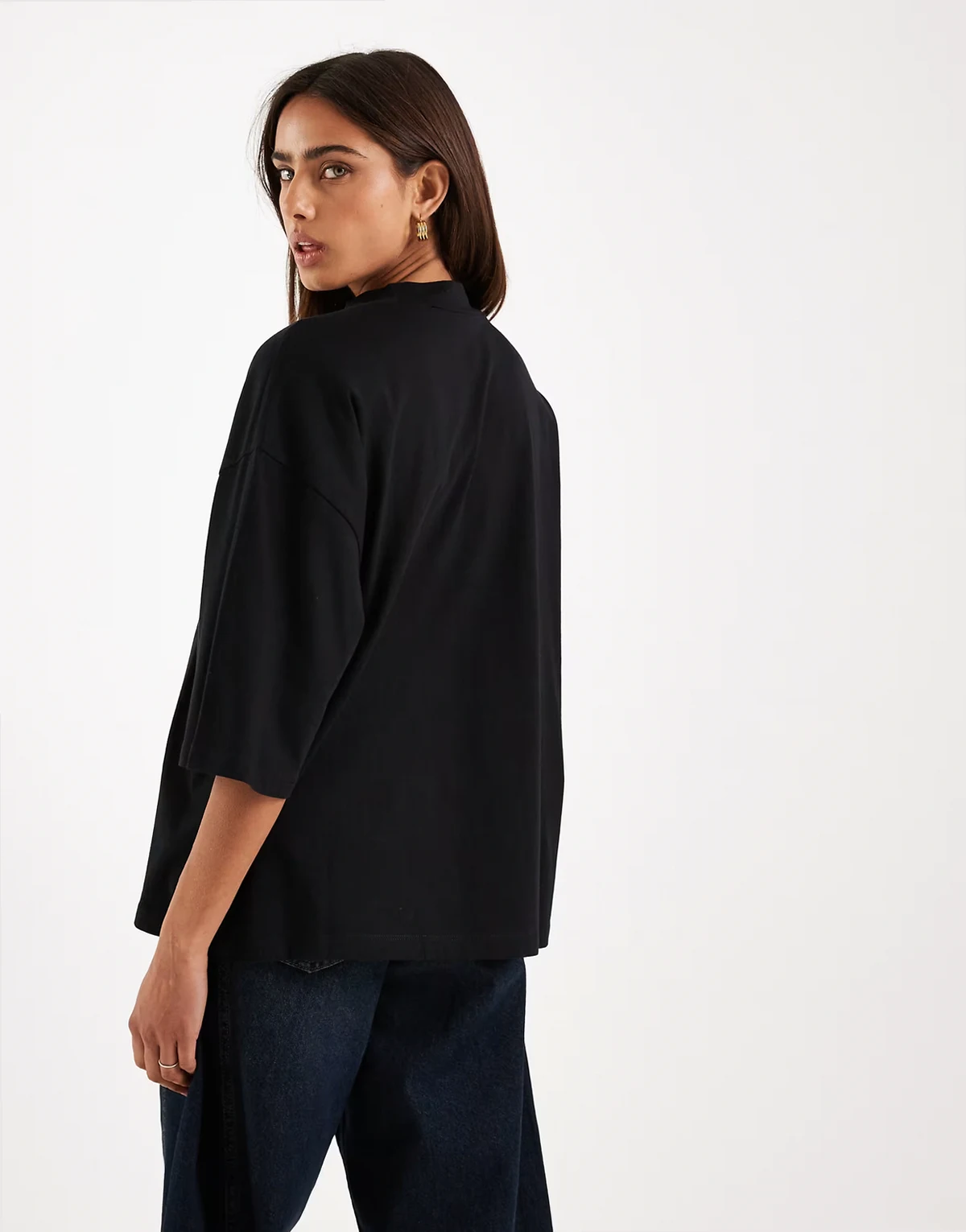 – Czarny T-shirt oversize z obniżoną linią ramion
