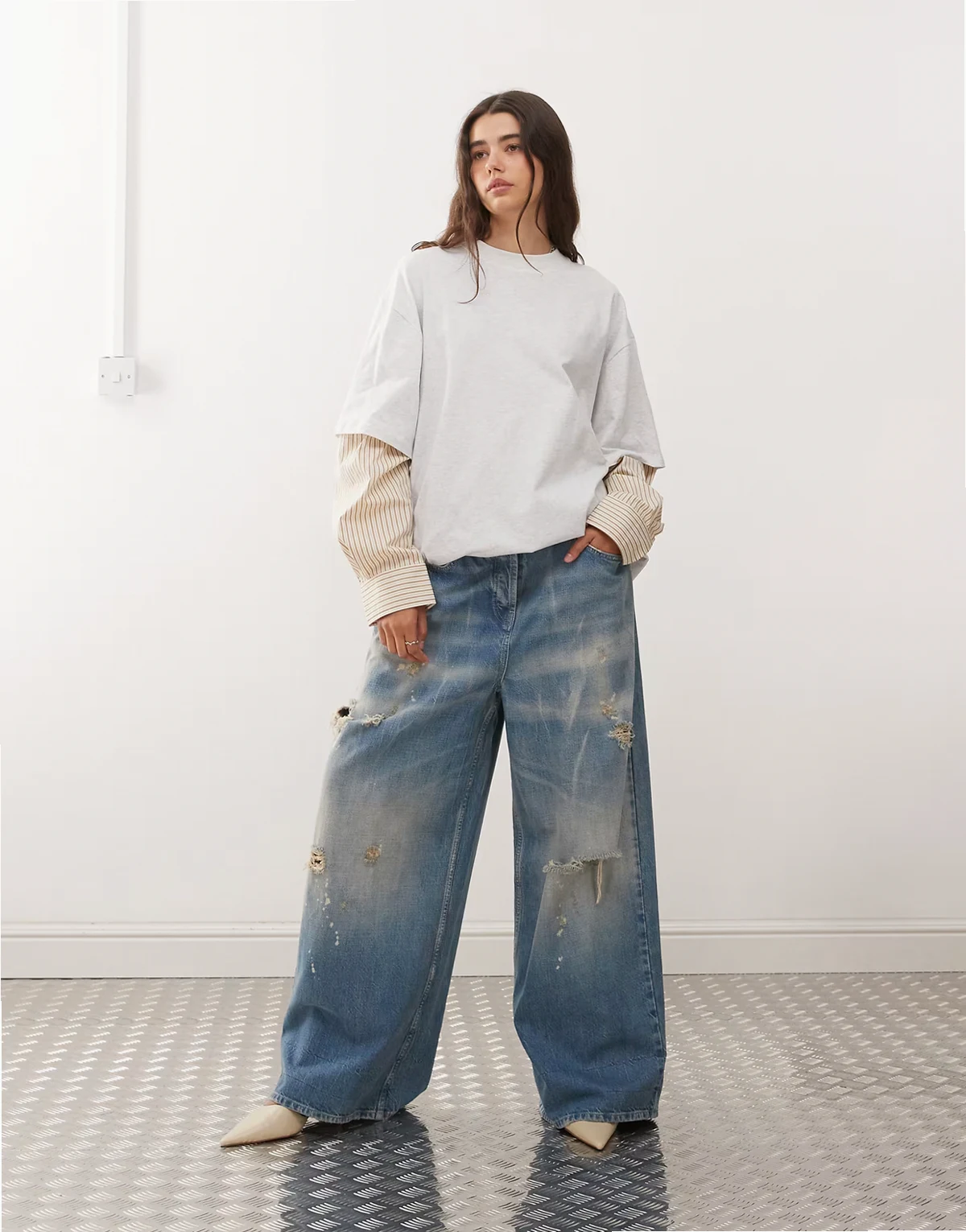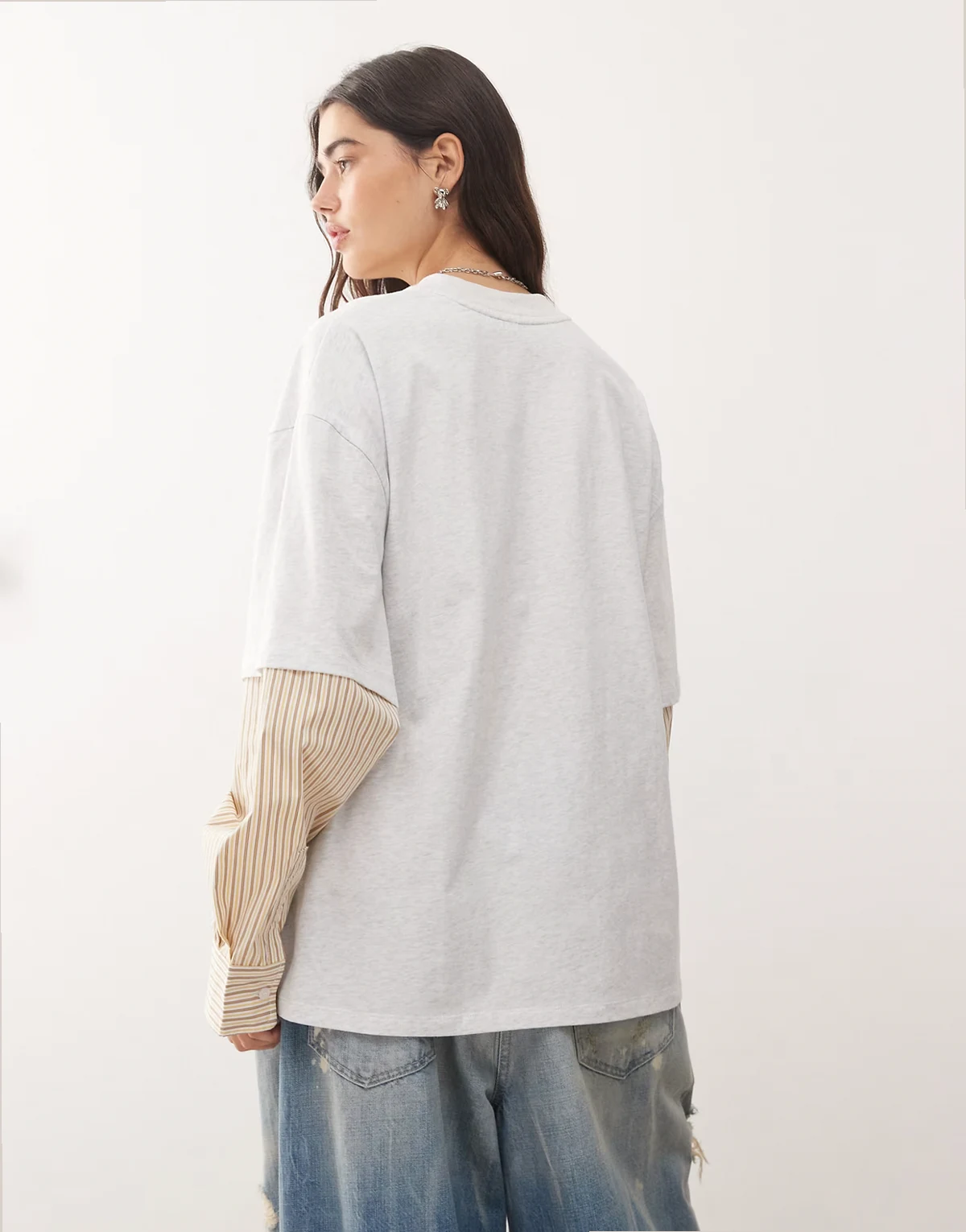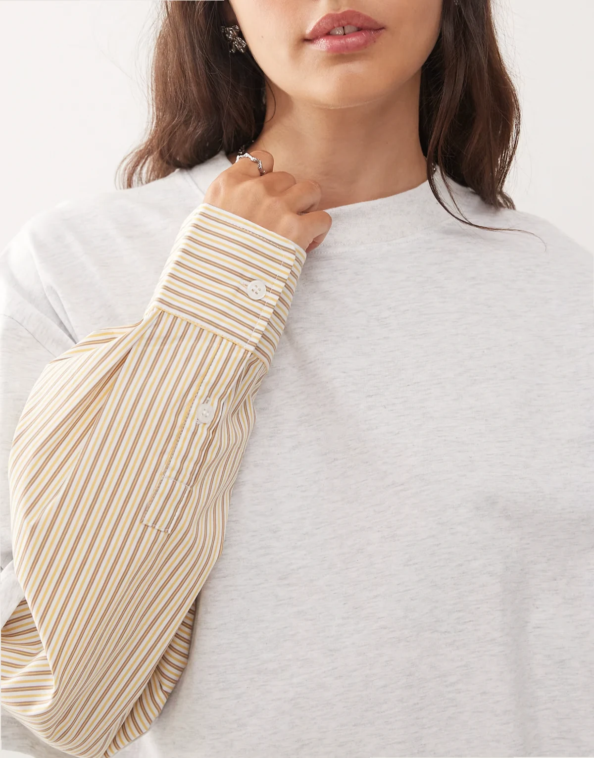 – Biały T-shirt oversize 2 w 1 z beżową koszulą z długimi rękawami w paski pod spodem