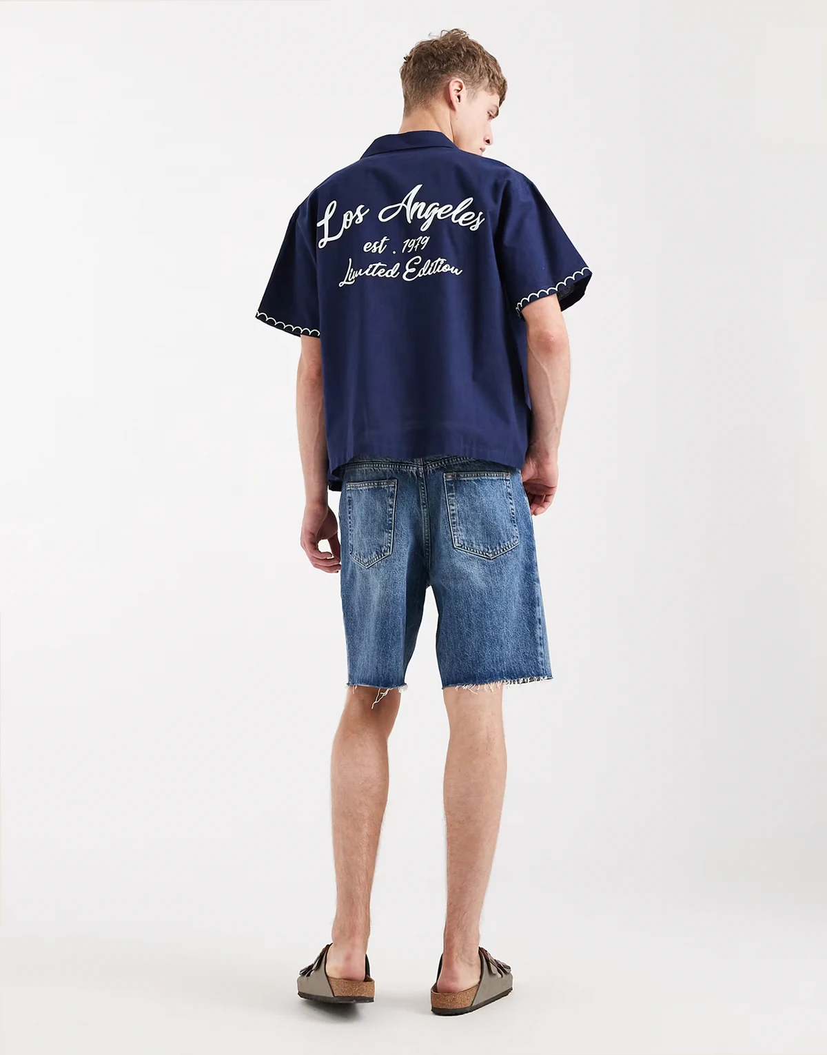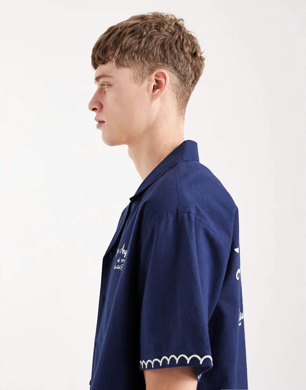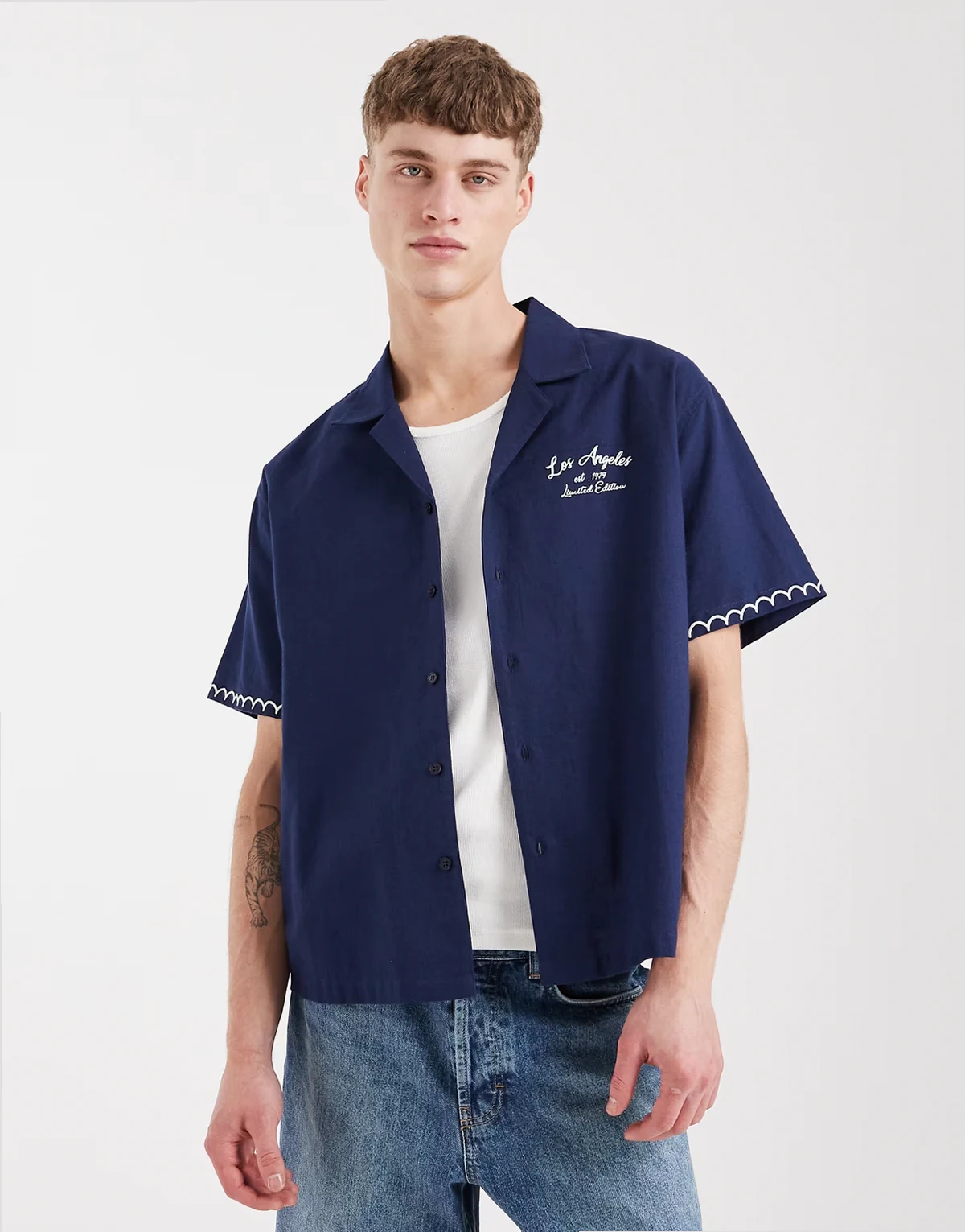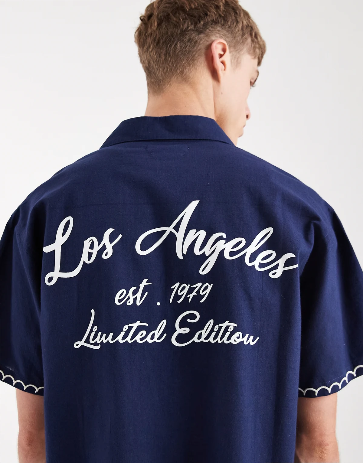 – Granatowa koszula plażowa z haftowanym napisem „LA”