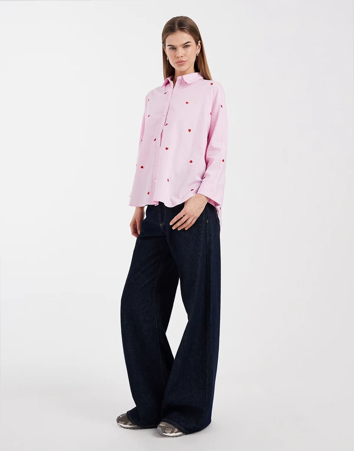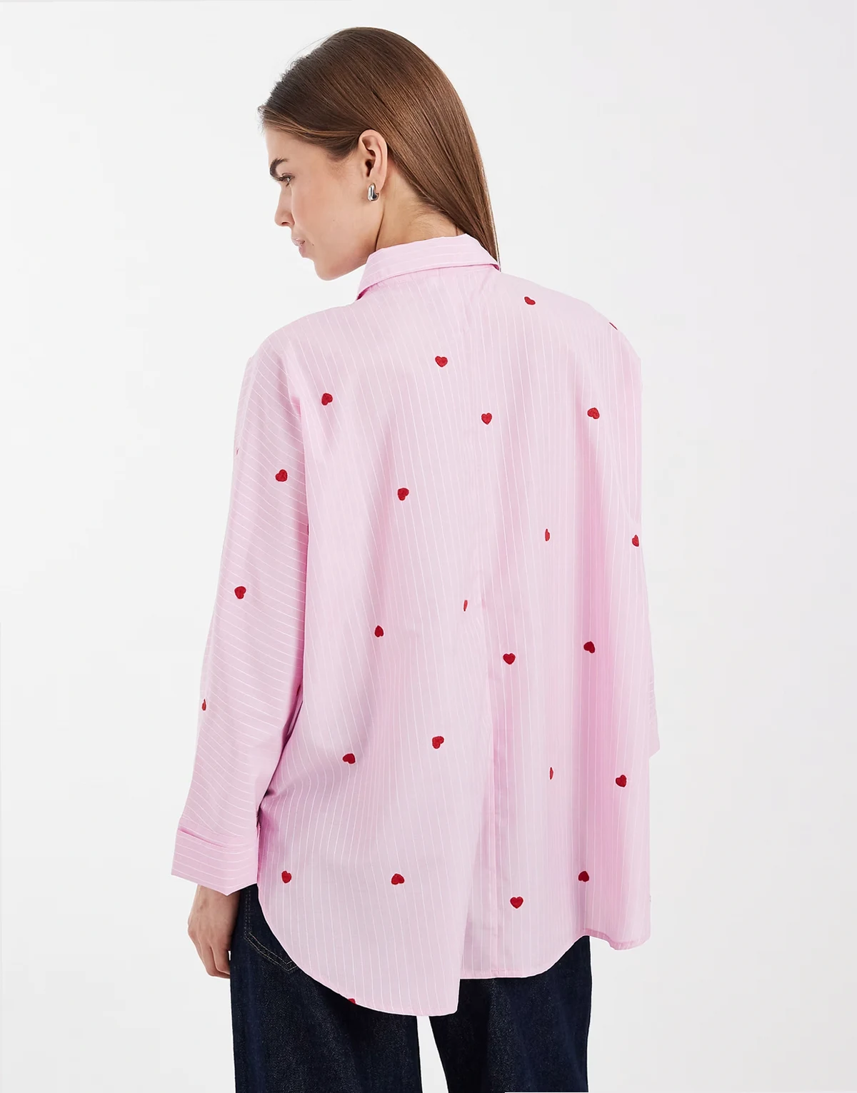 – Jasnoróżowa koszula w paski z wyhaftowanymi sercami