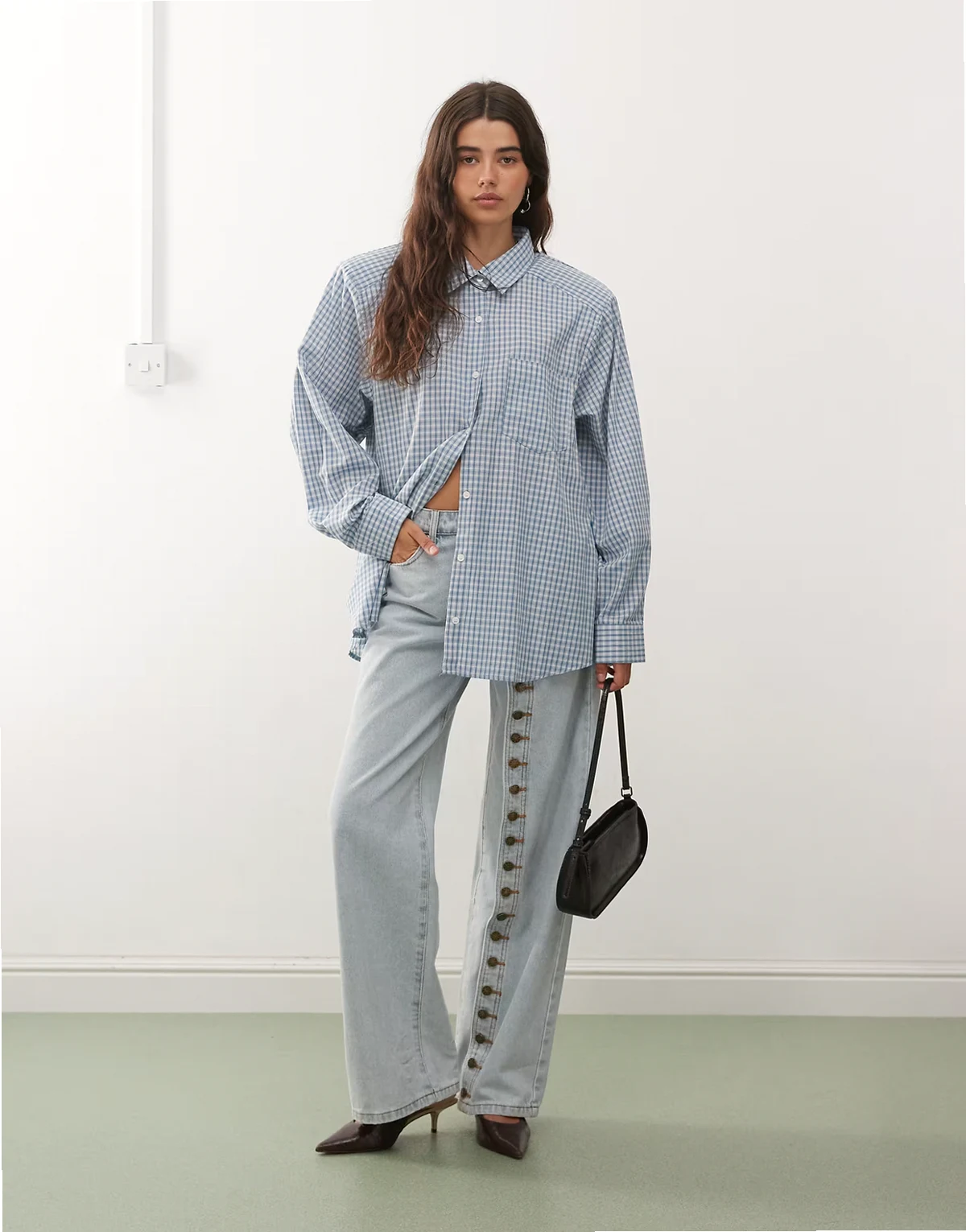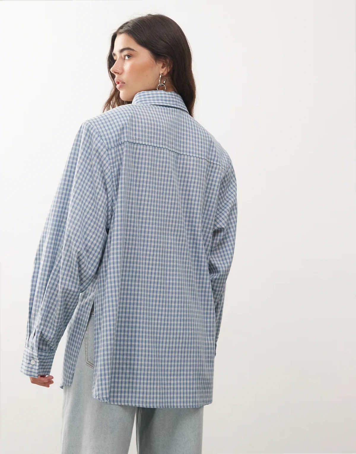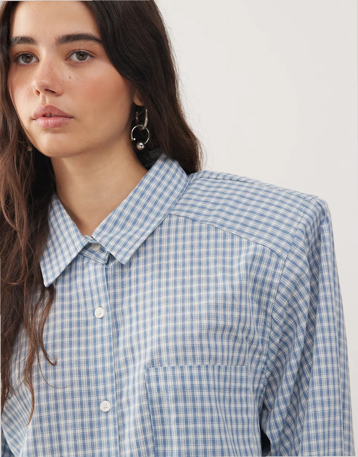 – Notting Hill – Zapinana na guziki koszula oversize w jasnoniebieską kratkę z poduszkami na ramionach