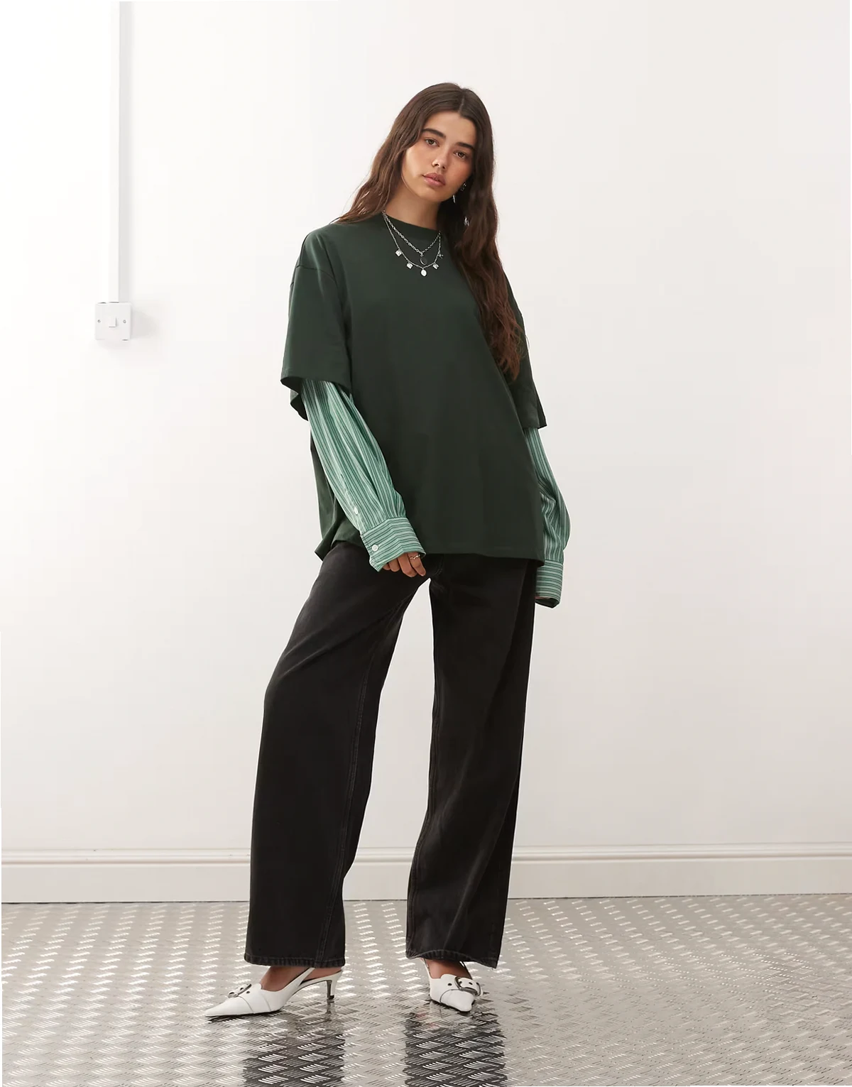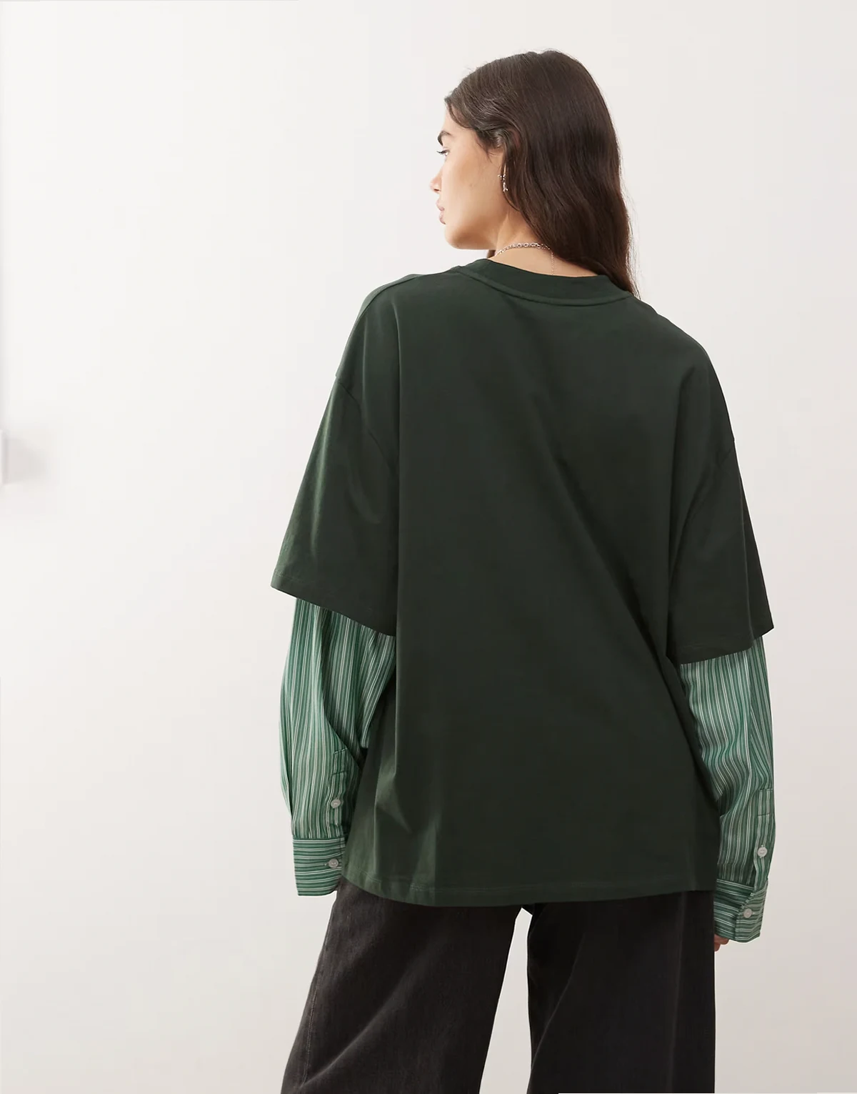 – T-shirt oversize 2 w 1 z długimi koszulowymi rękawami w ciemnozielono-zielone paski