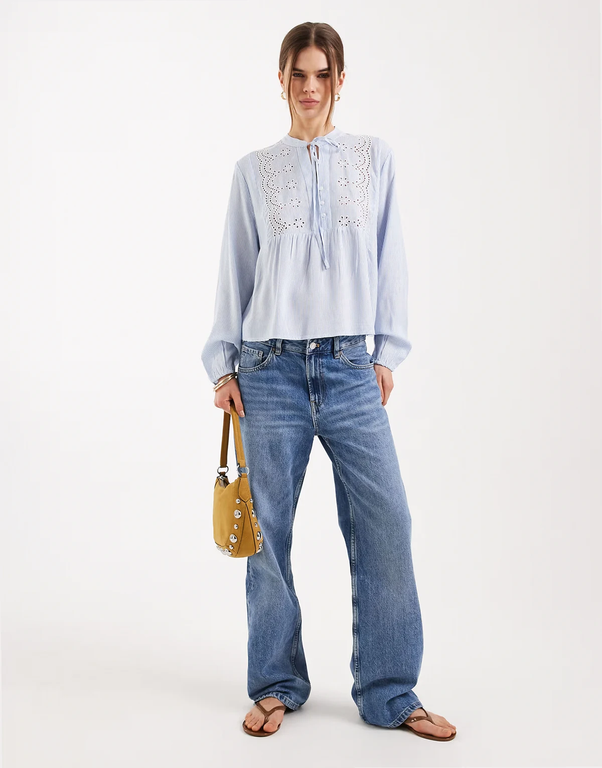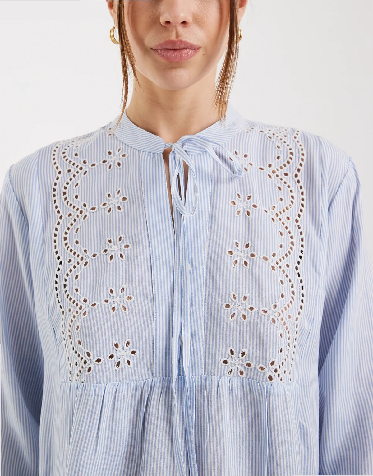 – Niebieska koszula w paski z koronkowymi wstawkami